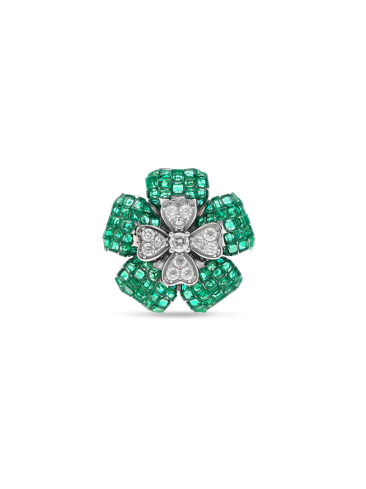 Recreating the iconic silhouette of petals gently swaying in the breeze with opulent clusters of pave set luscious pink zirconia stones making their way towards the star shaped center shimmering brightly with white cubic zirconia, this striking statement ring is your escape into the Enchanted Forest that blooms just for you!