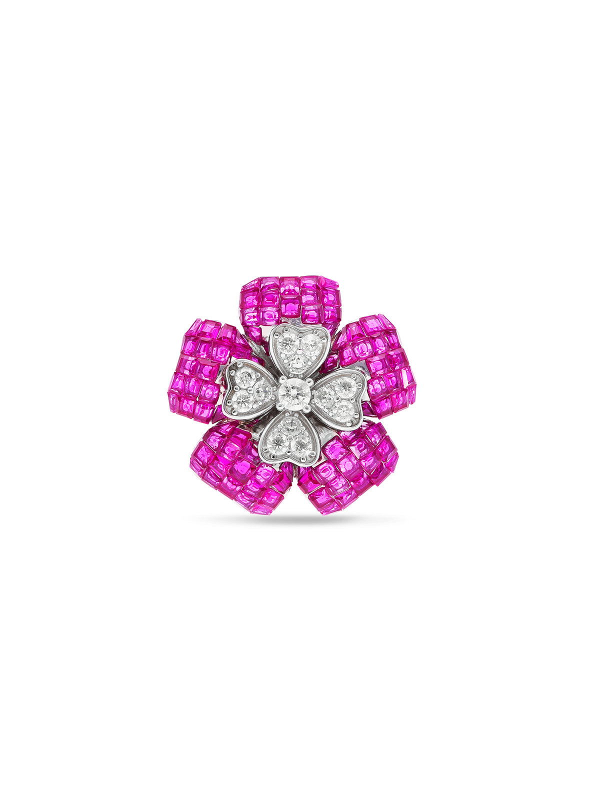 Recreating the iconic silhouette of petals gently swaying in the breeze with opulent clusters of pave set luscious pink zirconia stones making their way towards the star shaped center shimmering brightly with white cubic zirconia, this striking statement ring is your escape into the Enchanted Forest that blooms just for you!
