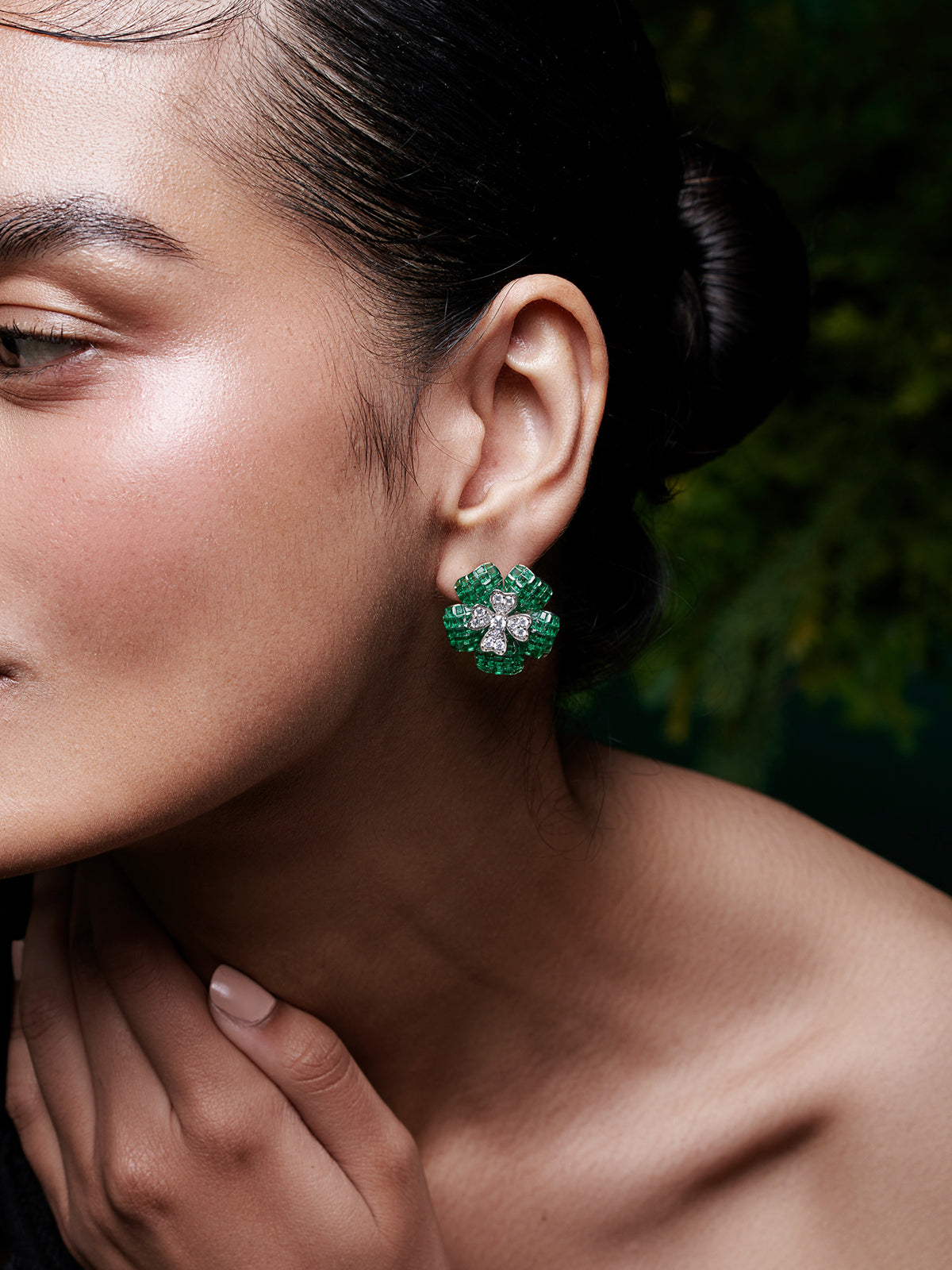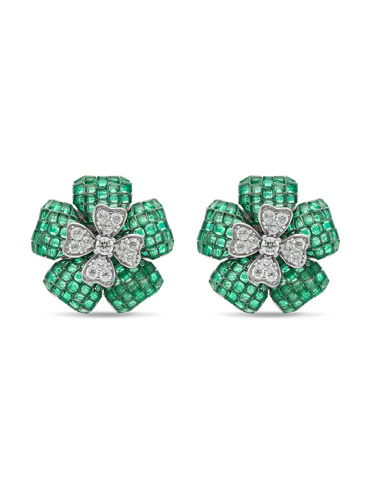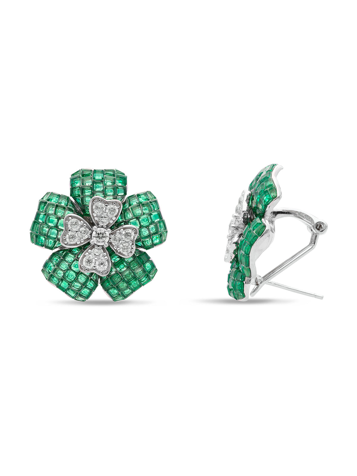 Recreating the iconic silhouette of petals gently swaying in the breeze with opulent clusters of pave set emerald green zirconia stones making their way towards the star shaped center shimmering brightly with white cubic zirconia, this delicate yet striking pair of stud earrings are your escape into the Enchanted Forest that blooms just for you!