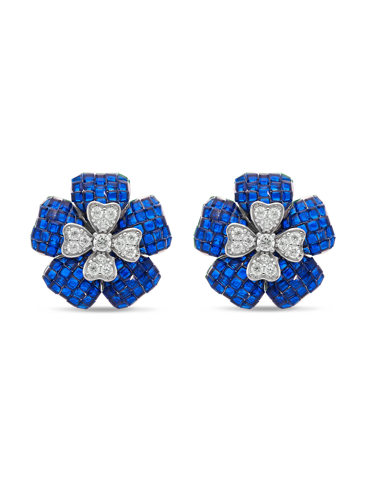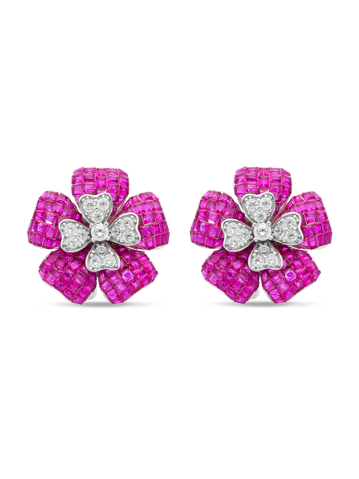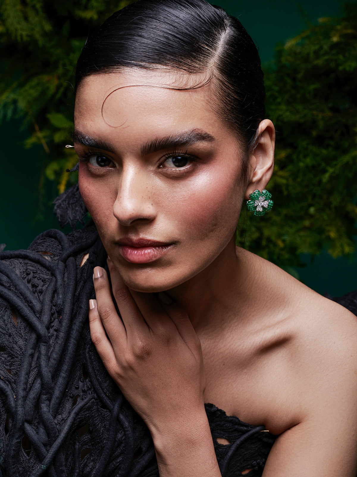 Recreating the iconic silhouette of petals gently swaying in the breeze with opulent clusters of pave set emerald green zirconia stones making their way towards the star shaped center shimmering brightly with white cubic zirconia, this delicate yet striking pair of stud earrings are your escape into the Enchanted Forest that blooms just for you!