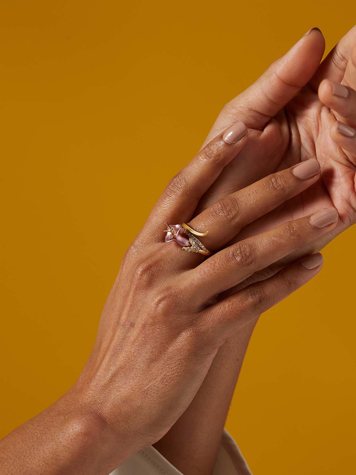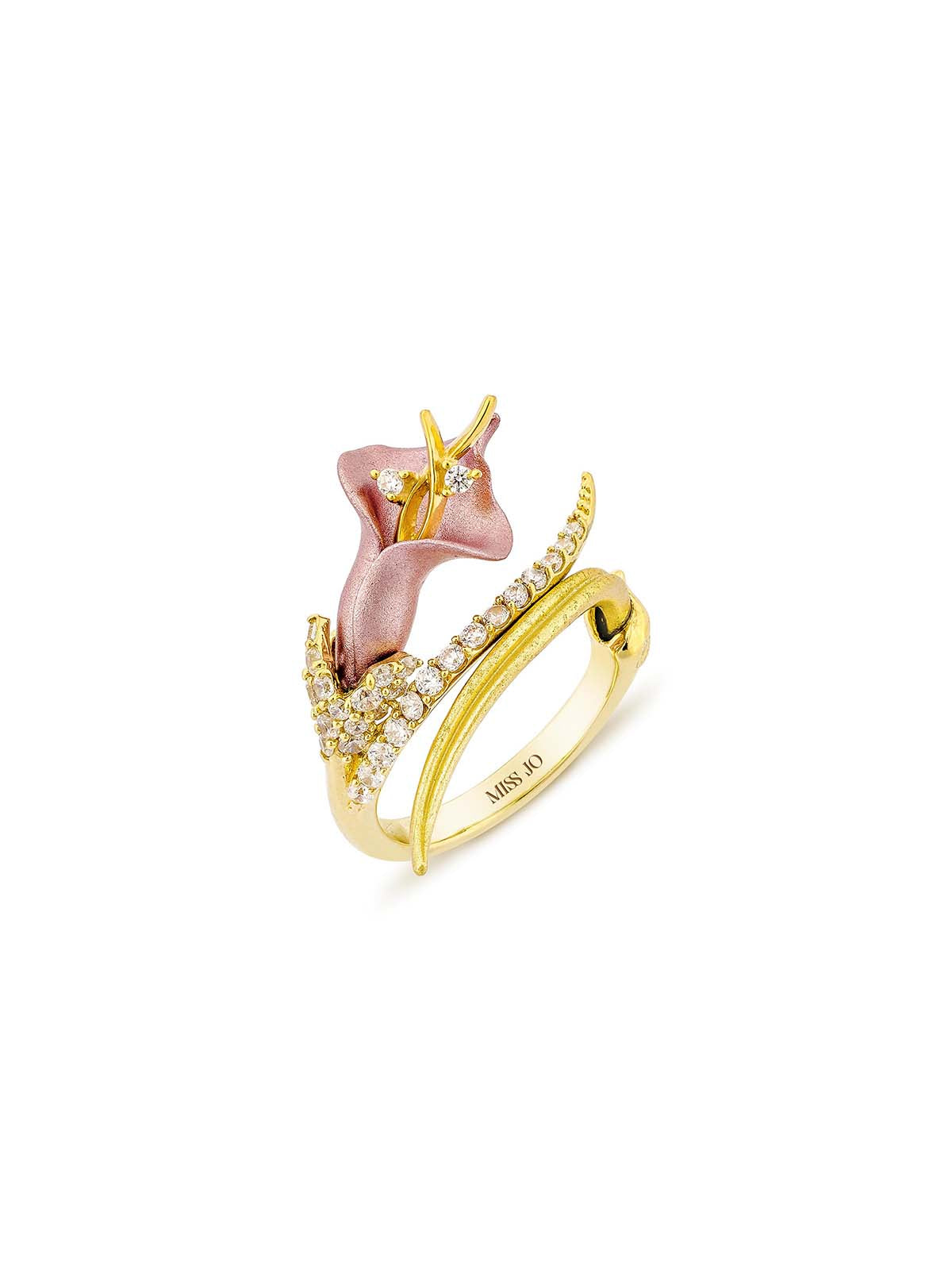 Sleek in design, this ring is a poetic tribute to Nature's floral marvels. Inspired by the Calla Lily flower, this ring is handset in silver and depicts the onset of blooming season through the delicate hues of pink, green and White Enamel.