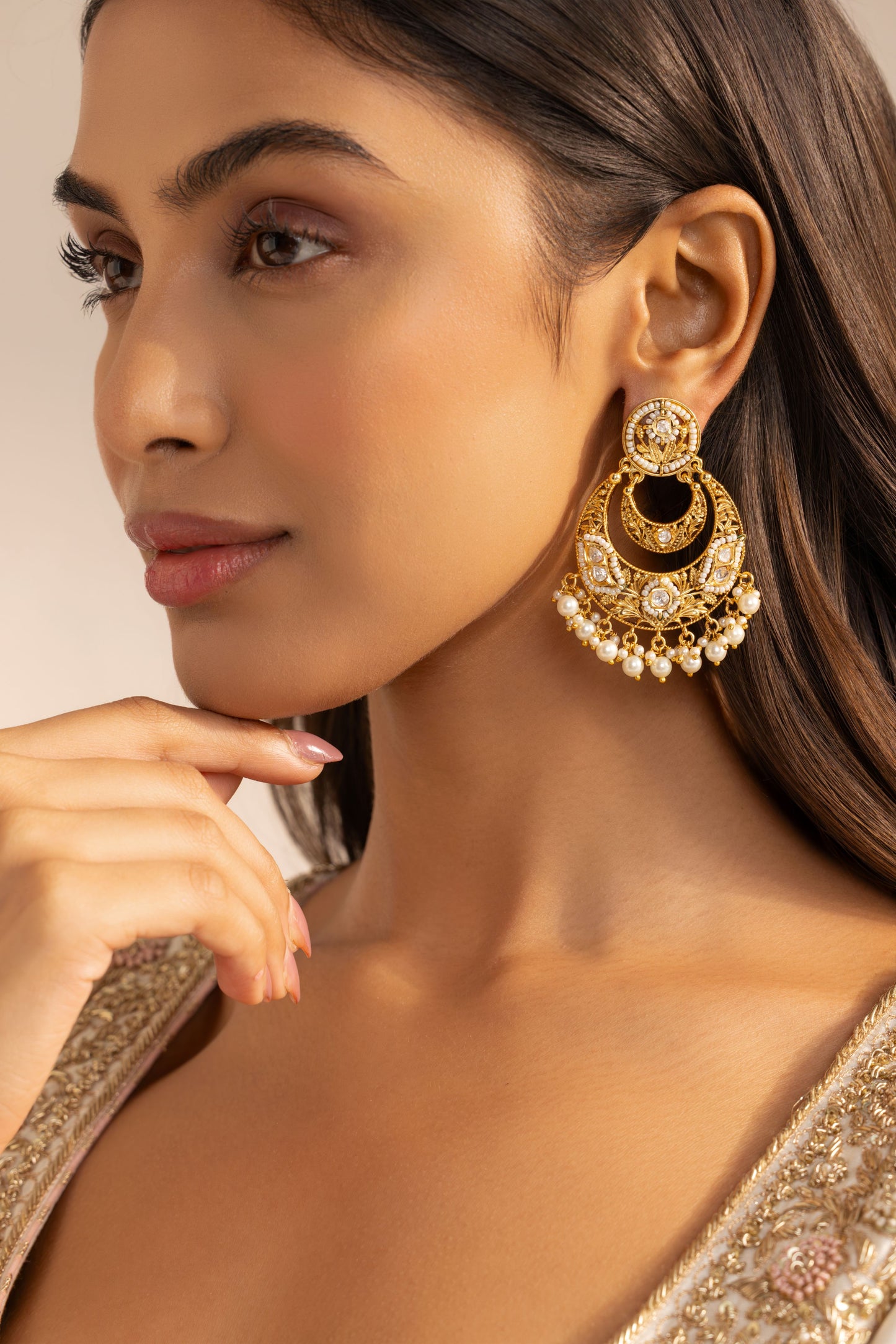 Regular price ₹ 5,805Ethereal and ornate, The Aabha Chandbalis radiate heritage charm with their crescent silhouette and cascading pearls. Set in a warm copper-brass alloy and encrusted with Polki stones, they evoke the grandeur of temple artistry reimagined for the modern muse. Perfect for festive soirées or bridal celebrations, these earrings bring a luminous touch of tradition to every look.