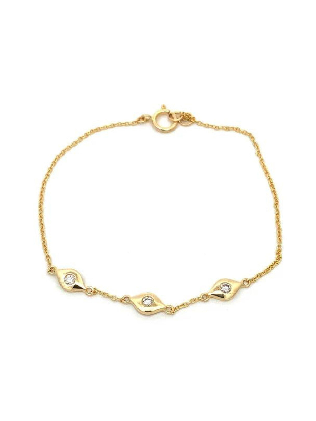 Handcrafted in 14k solid yellow gold this evil eye bracelet is perfect to be stacked along with other bracelets. the centre of all three evil eyes are adorned with colourless diamonds.