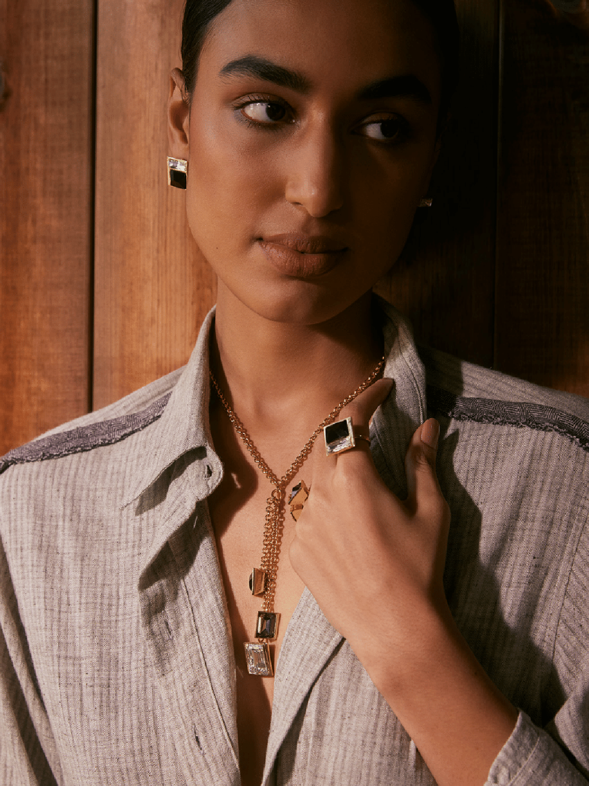 This crystal earring, plated in 18k gold, celebrates the bold and vibrant hues of two entwined crystals. It delivers an understated elegance complementing you, while you let your hair down and have fun.