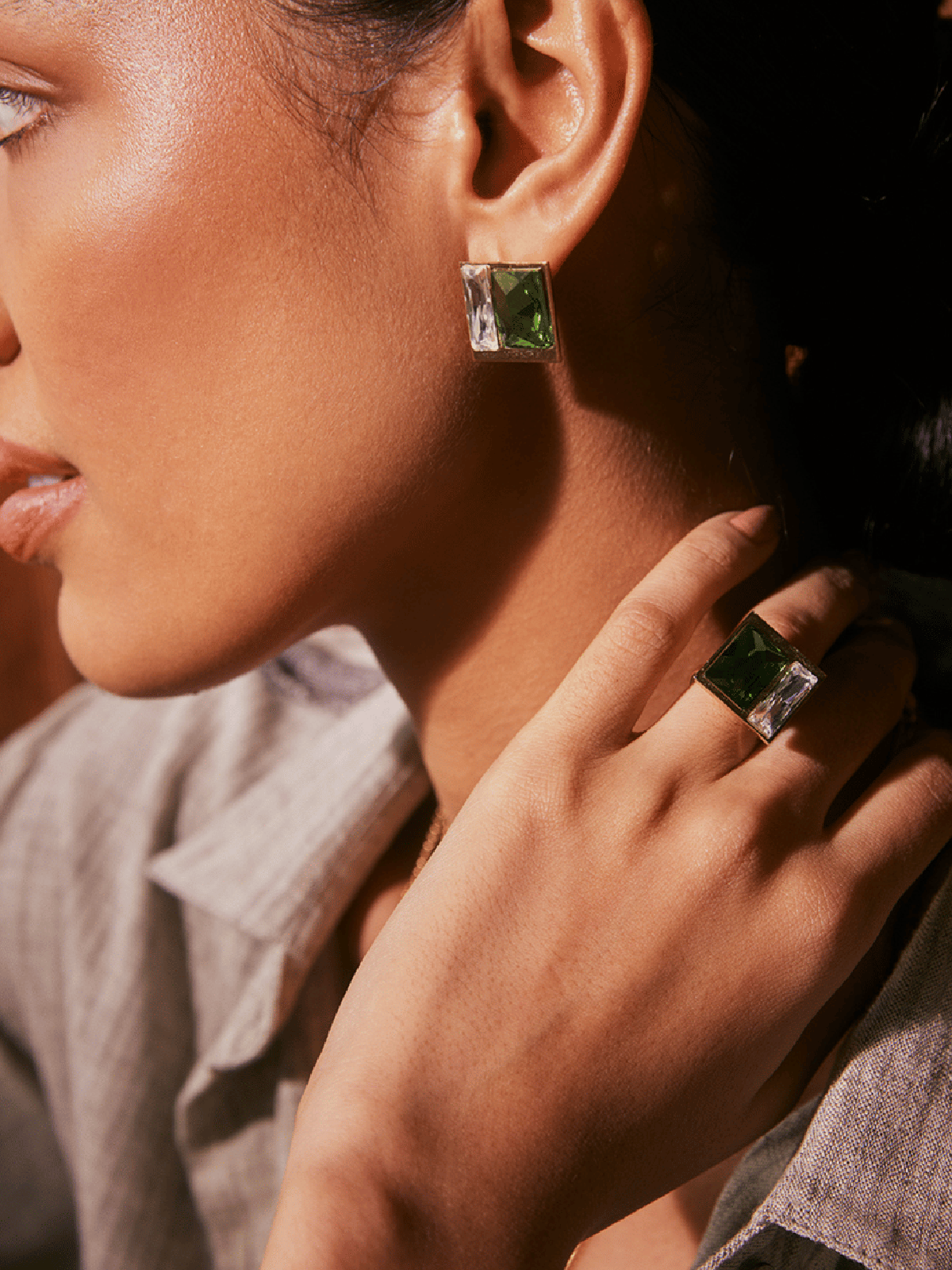 This crystal earring celebrates the bold and vibrant hues of two entwined crystals. It delivers an understated elegance complementing you, while you let your hair down and have fun.