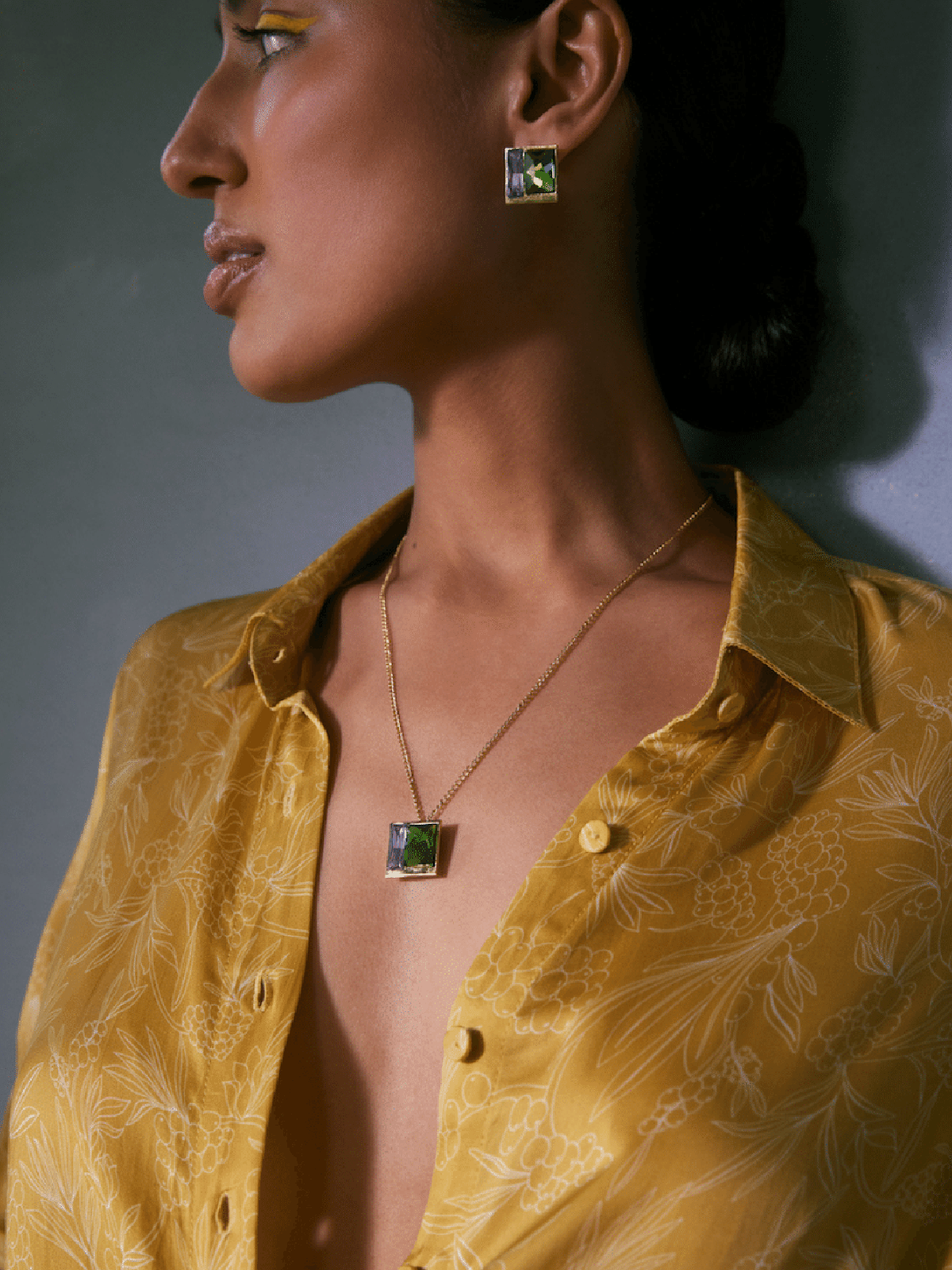 The "Limited Edition" fusion necklace, plated with 18k gold, fuses 2 majestic colors - fern and aqua. The two colors are distinct, sparking through precision-cut crystals, and yet in perfect harmony. This is a necklace that will draw attention due to the multiple hues but keep that attention on you.