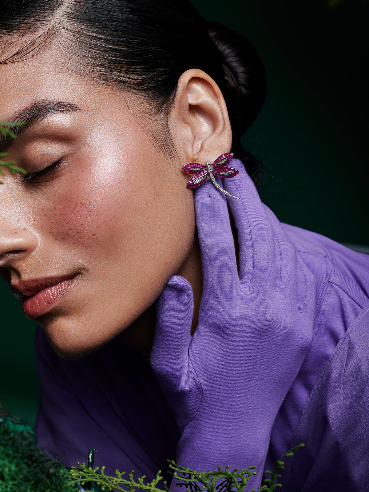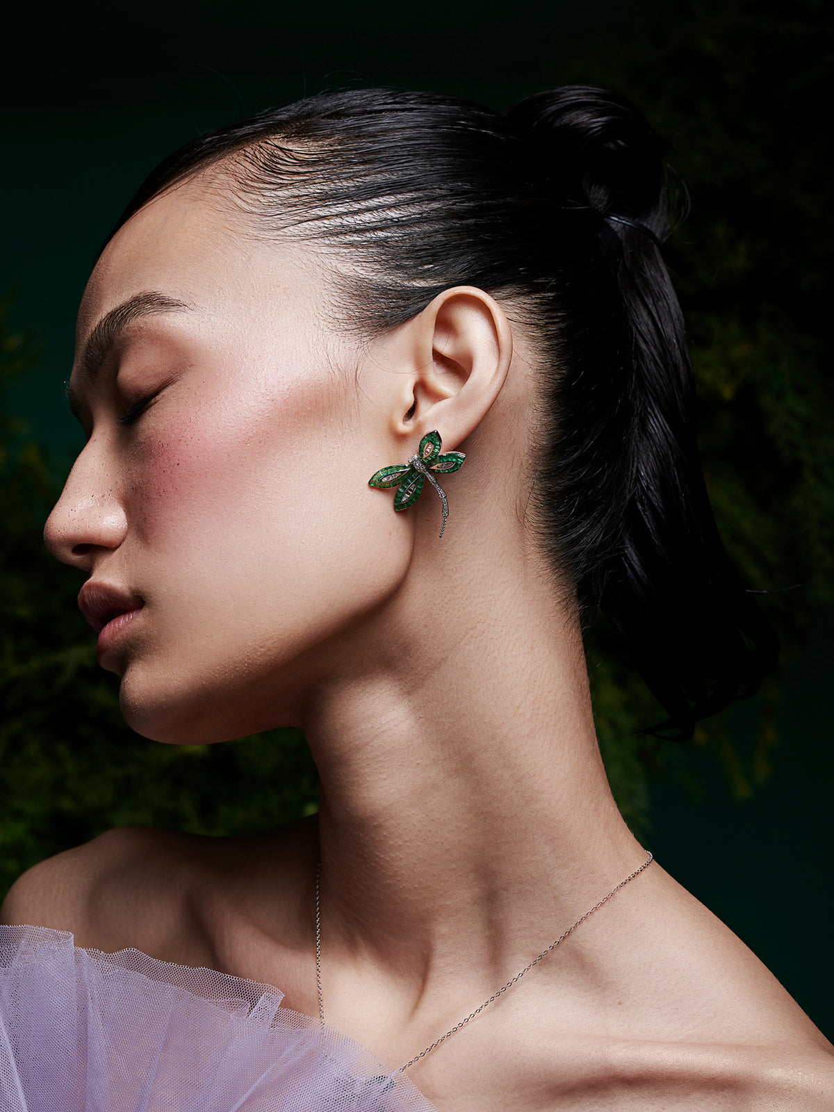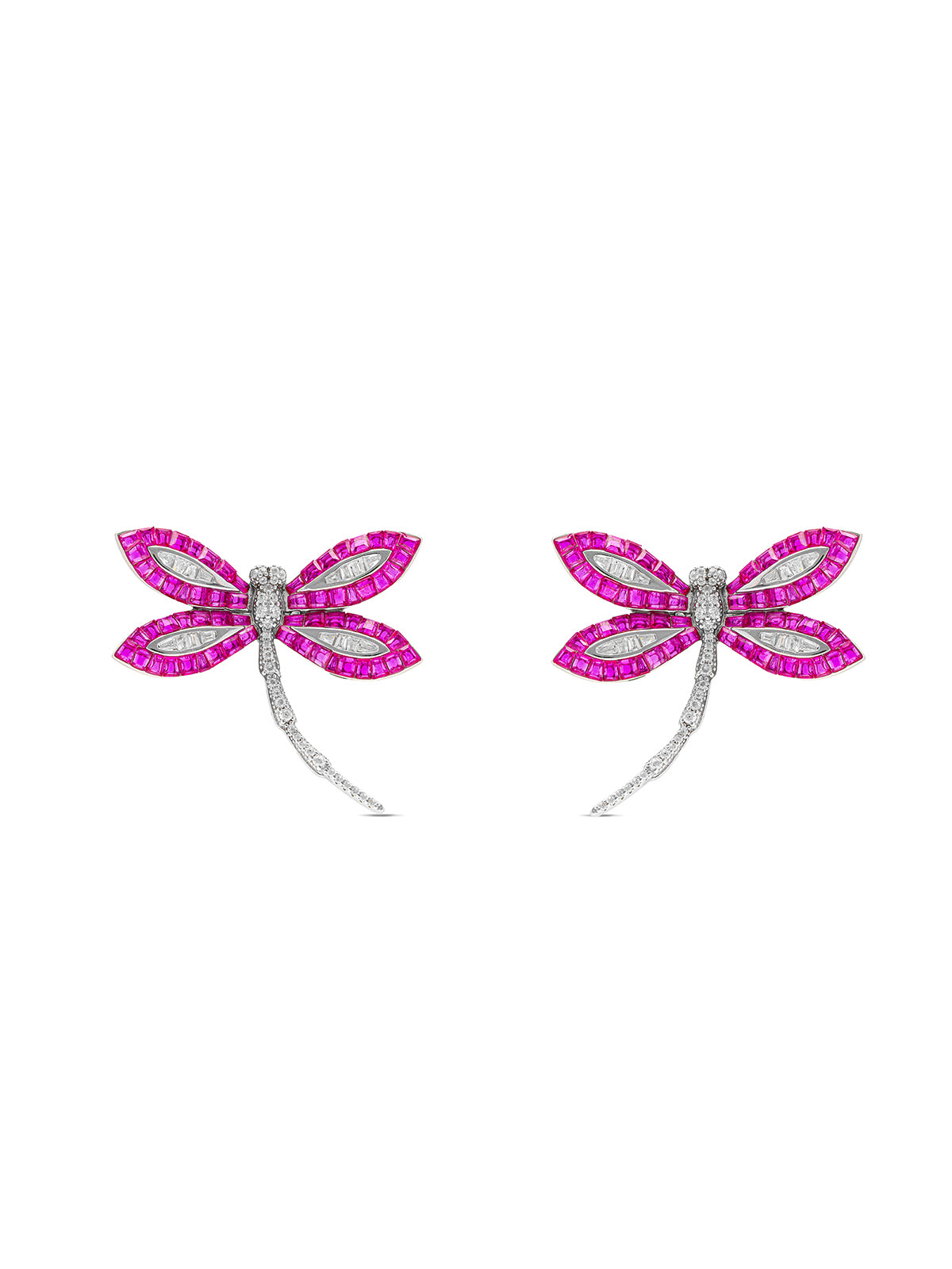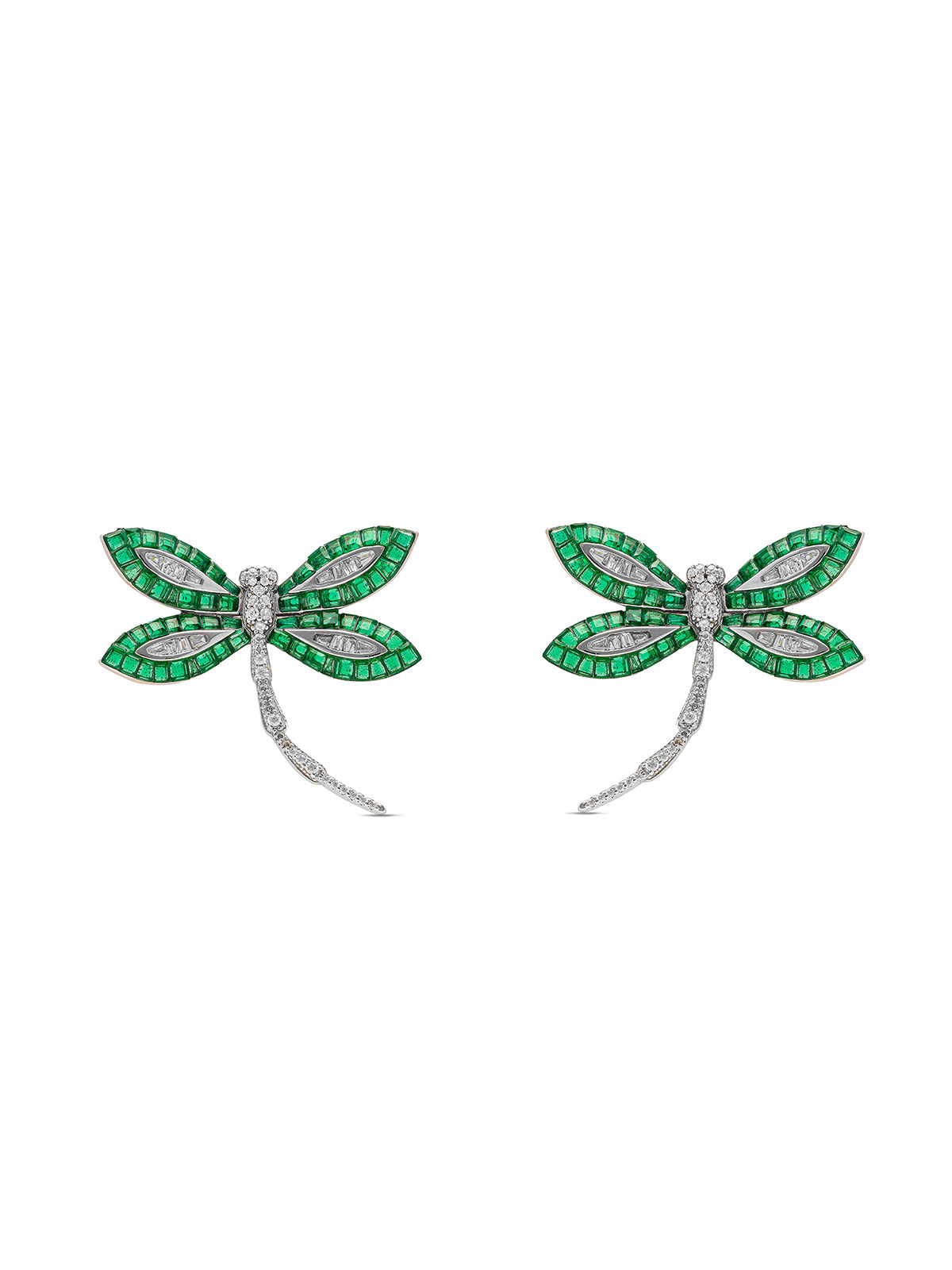 The delicate beauty of dragonflies meets the mystical allure of an enchanted woodland. The sterling silver wings are adorned with tiny emerald green spinel stones that reflect the hues of the forest, create a mesmerizing play of color reminiscent of sunlight filtering through the leaves.