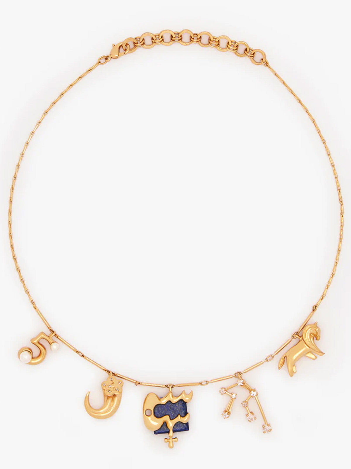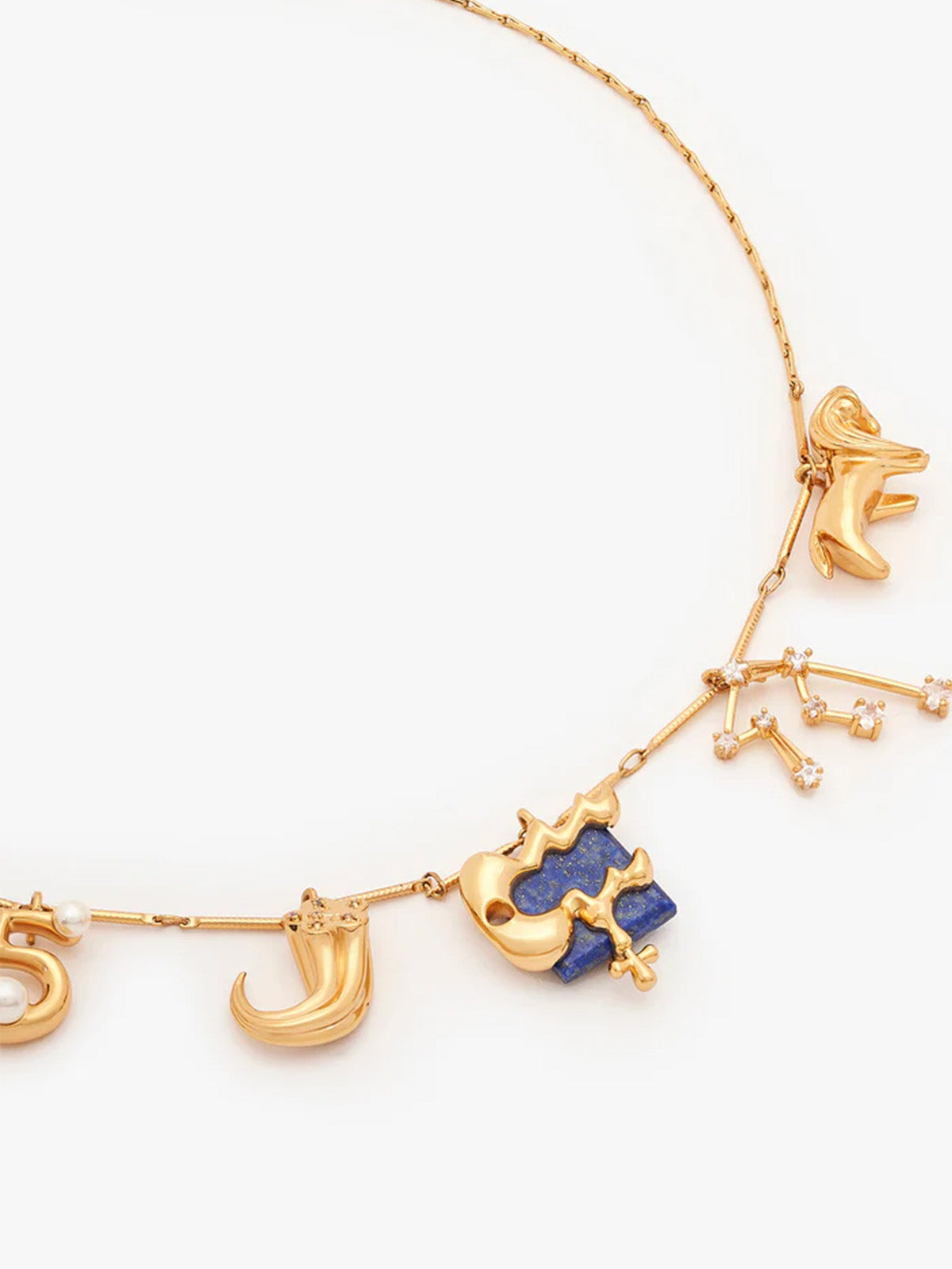 Craft your own celestial story with a bespoke cosmic masterpiece that allows you to weave your own universe. The Aquarius zodiac motif, set in the semi-precious Lapis Lazuli and paired with the Aquarius constellation charm, forms the heart of your piece. Personalise it with exquisite good luck charms, including your fortune number, guiding spirit animal, and additional celestial constellations, elegantly embellished with the OH celestial poppy tusk. Meticulously handcrafted, these delicate charms are designed to encapsulate your elegance and individuality. Finished in 22k gold.