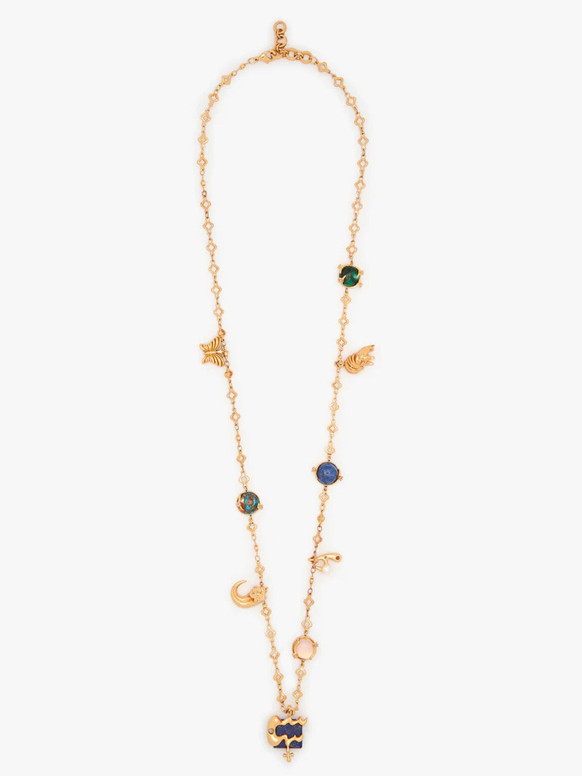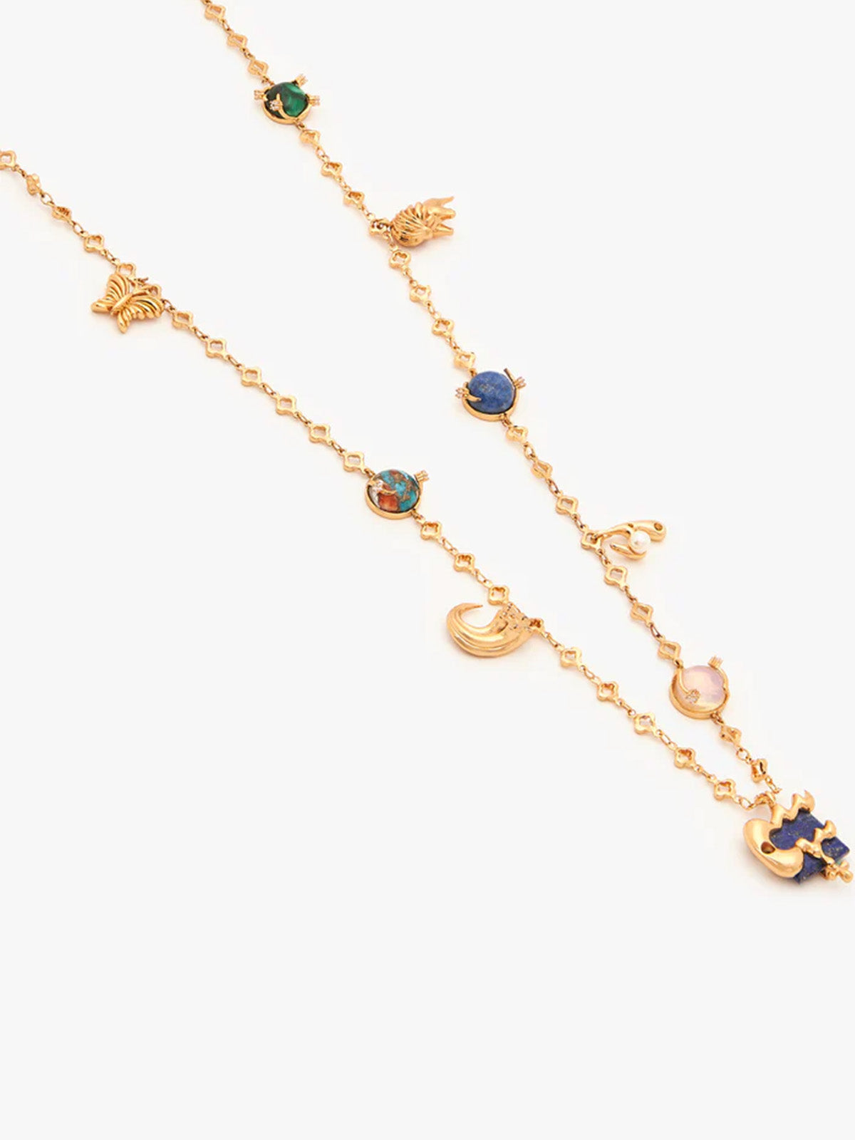 Vintage Celestial Halo Necklace celebrates the alluring accents of the yesteryears, reinterpreted with a chic, contemporary edge.The Aquarius zodiac motif, set in the semi-precious Lapis Lazuli forms the heart of your piece. Personalise your necklace with exquisite good luck charms that include your fortune number and spirit animals. Accentuated with semi-precious stones such as Malachite, White Opal, and American Turquoise, sparkling cubic zirconia and the OH celestial poppy tusk this necklace exudes a sophisticated charm that mirrors the grandeur of classic aesthetics. Finished in 22k gold .