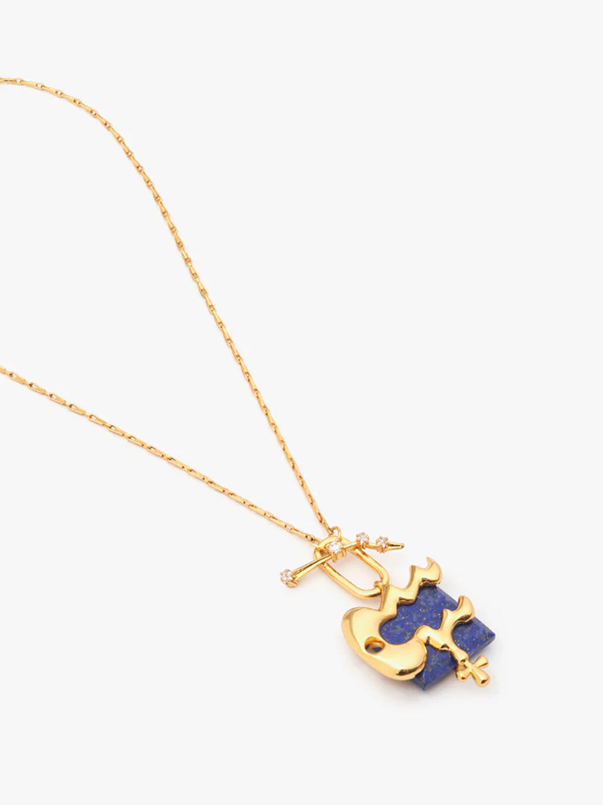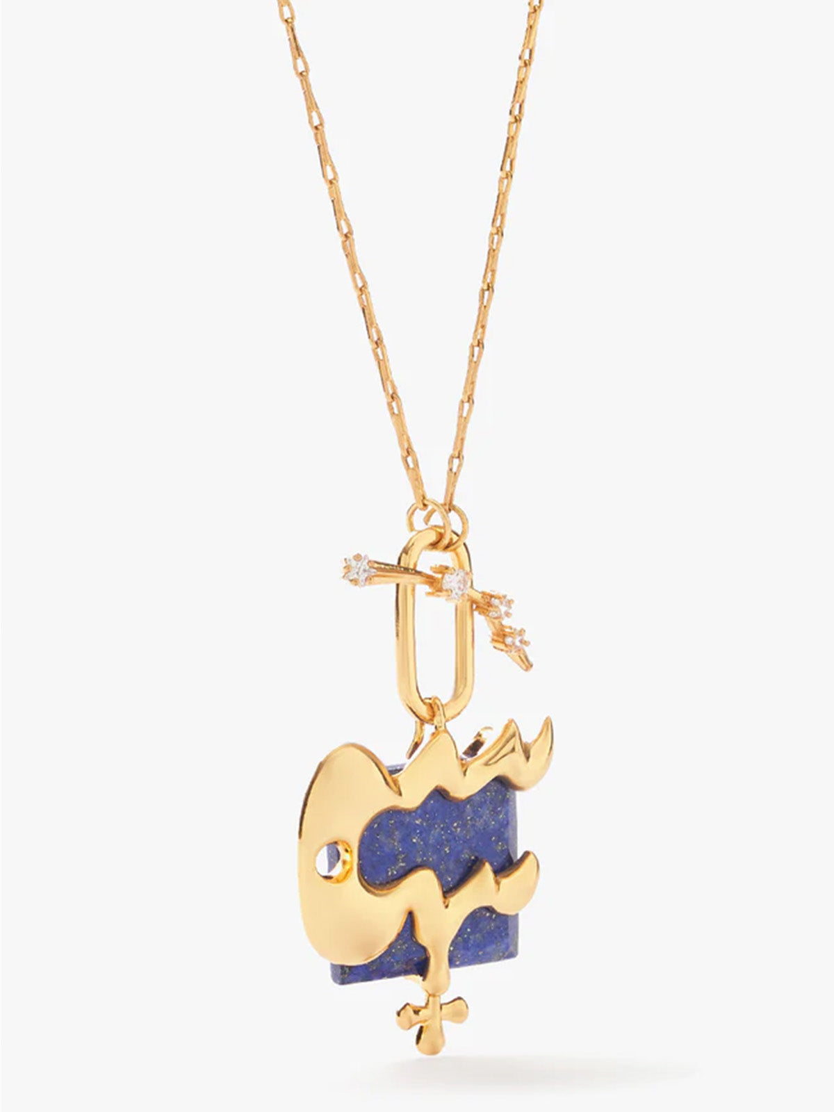 Inspired by the iconic bulbous design of the Lazuli Shroom Head, the Aquarius Zodiac Pendant is a sculptural masterpiece, paying homage to the house’s passion for astral wonders. At its heart lies an alluring lapis lazuli, while a T-clasp encrusted with sparkling cubic zirconia adds a sophisticated glint. Moulded in brass and plated with 22k gold, this pendant serves as a talisman for your inner brilliance, perfect for any day and every occasion.