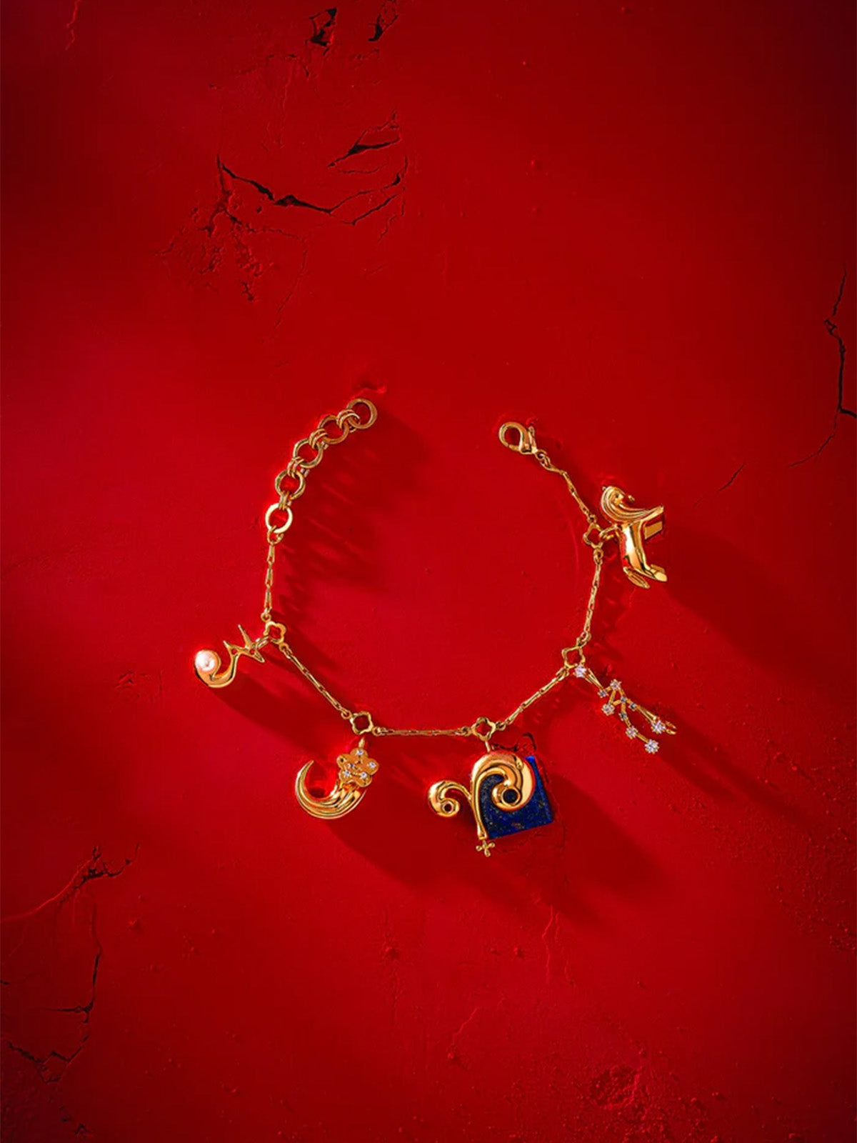 Craft your own celestial story with a bespoke cosmic masterpiece that allows you to weave your own universe. The Aries zodiac motif, set in the semi-precious Lapis Lazuli and paired with the Aries constellation charm, forms the heart of your piece. Personalise it with exquisite good luck charms, including your fortune number, guiding spirit animal, and additional celestial constellations, elegantly embellished with the OH celestial poppy tusk. Meticulously handcrafted, these delicate charms are designed to encapsulate your elegance and individuality. Finished in 22k rose