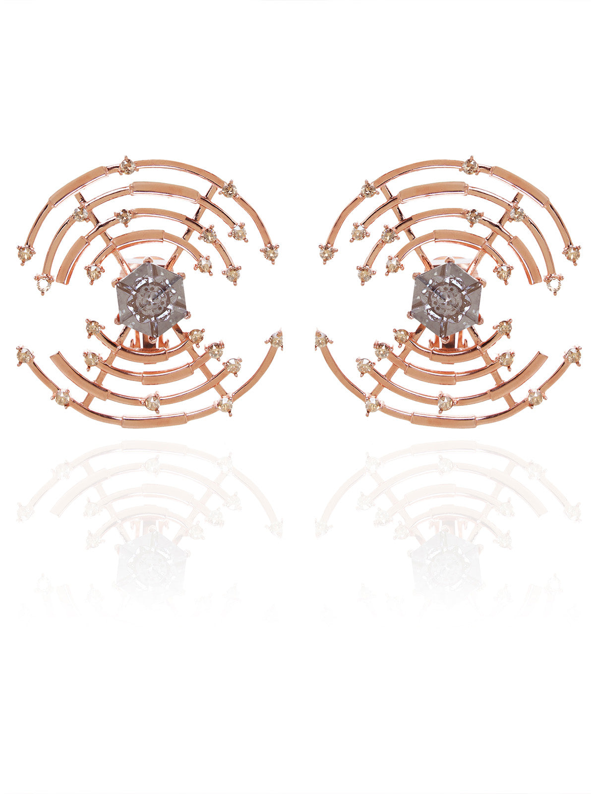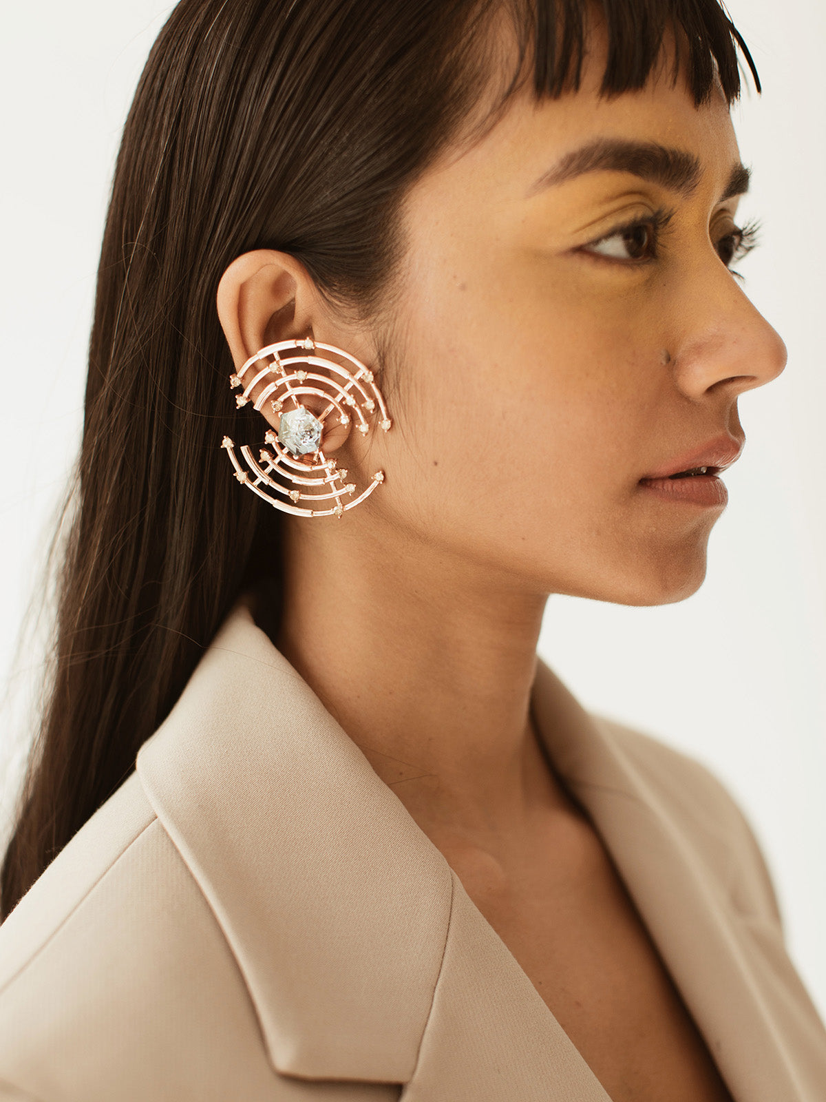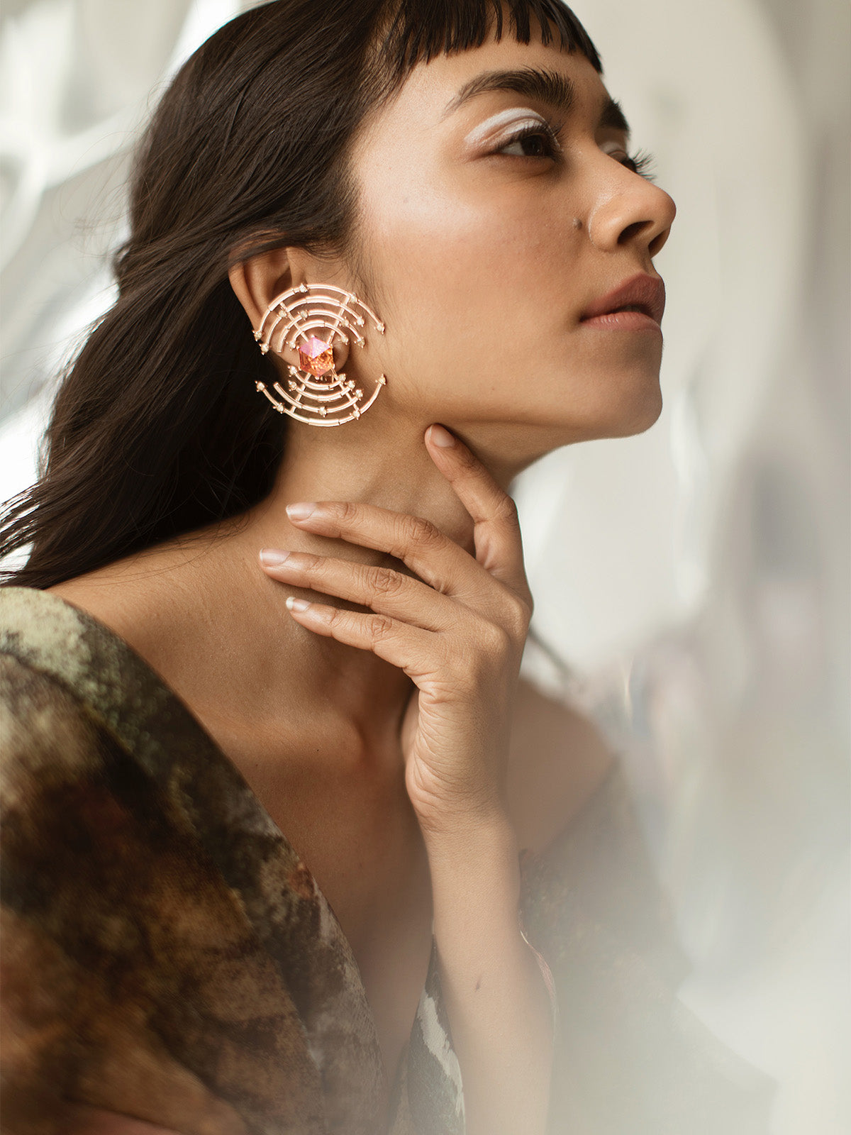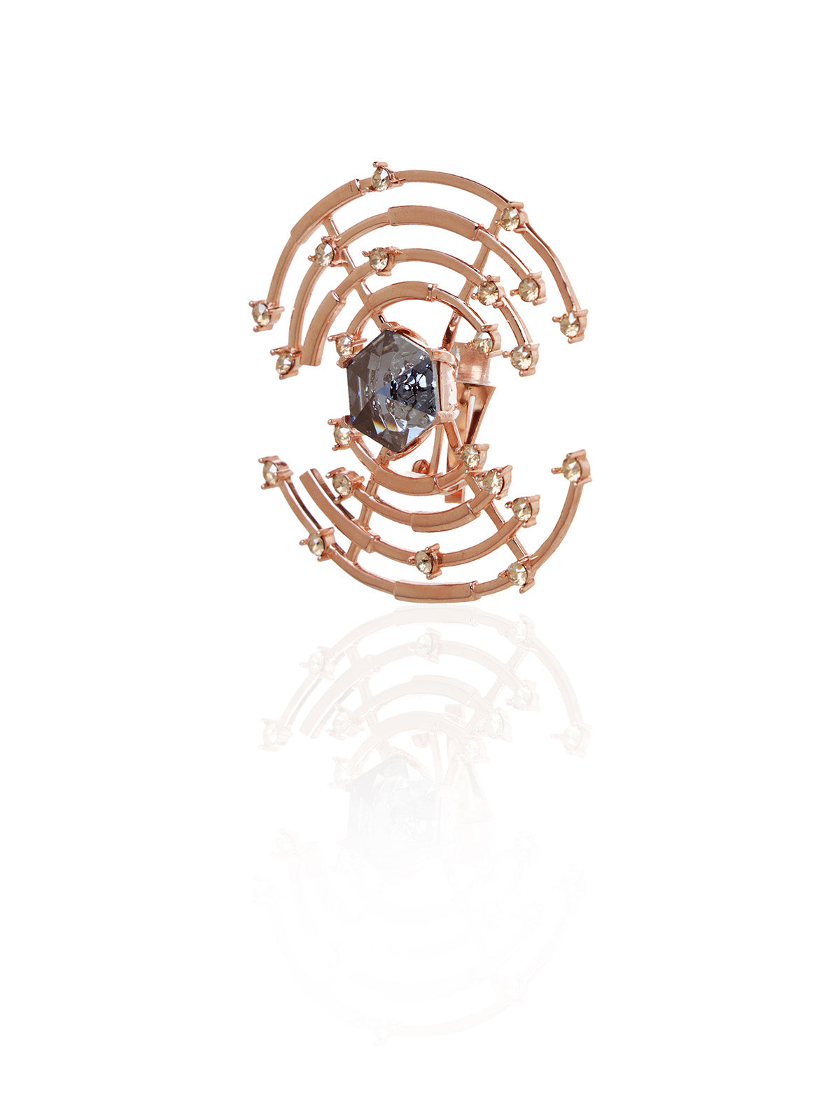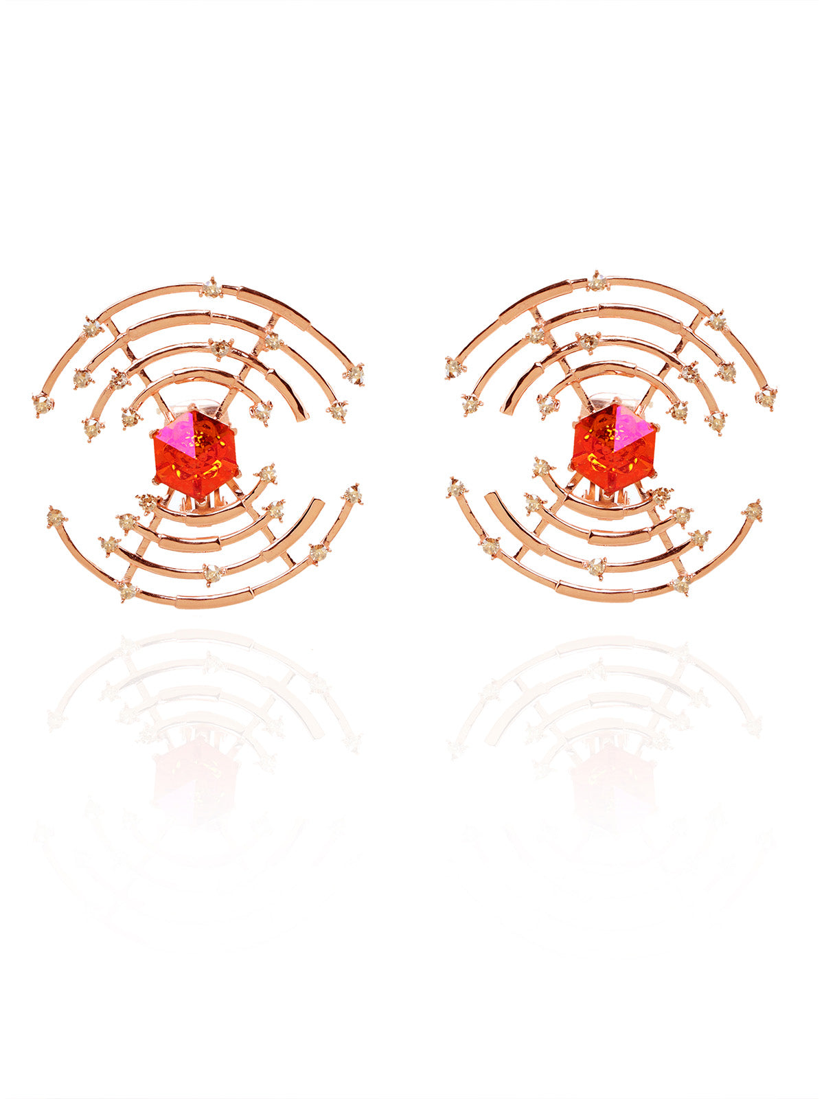Round curved metal lines stuuded with pp21 crystals and centred with a fuschia designer cut swarovski crystal