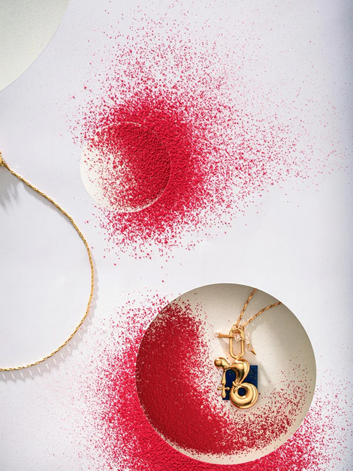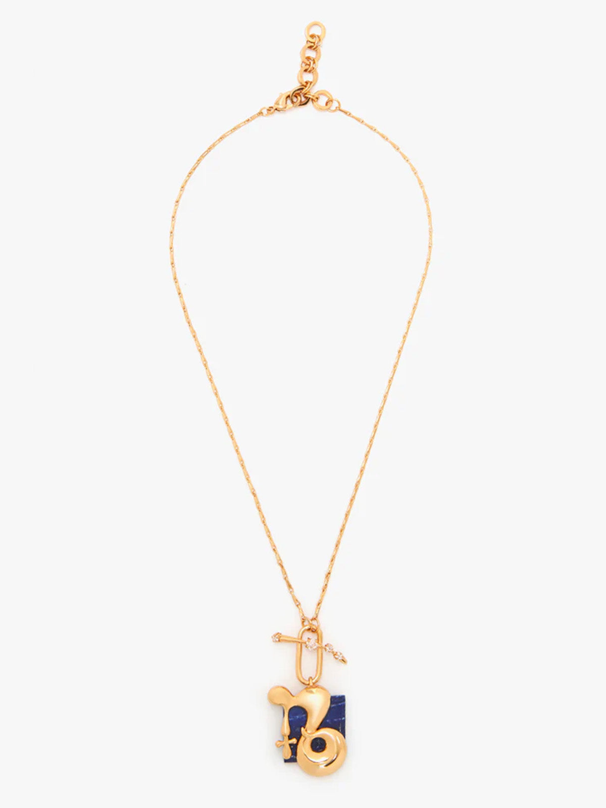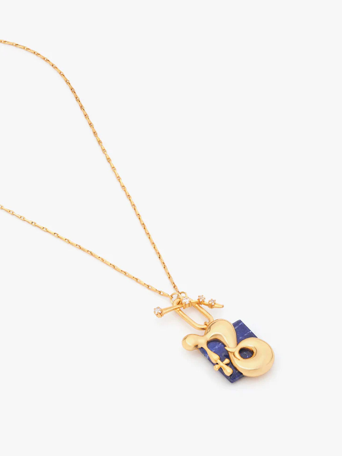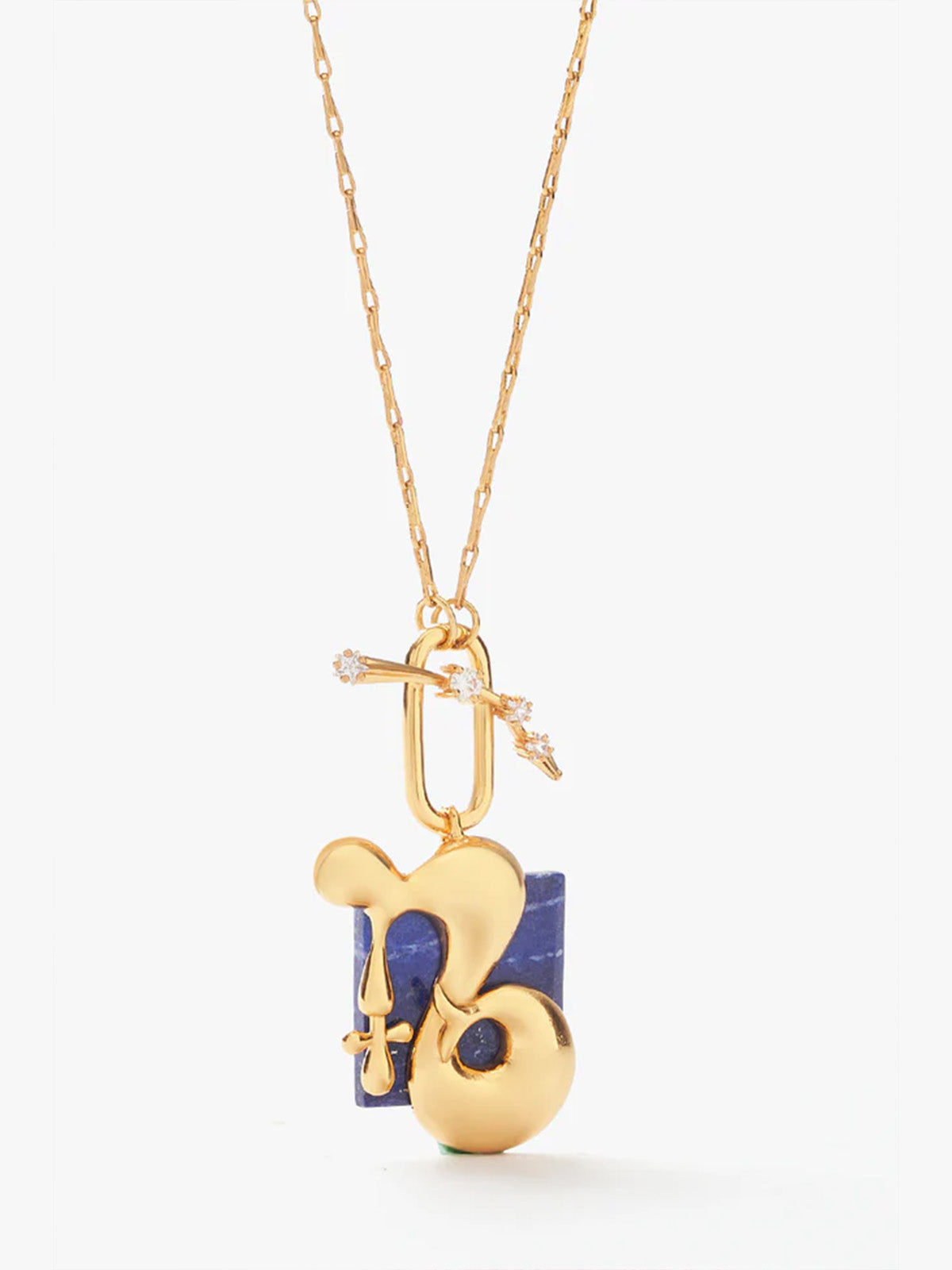 Inspired by the iconic bulbous design of the Lazuli Shroom Head, the Capricon Zodiac Pendant is a sculptural masterpiece, paying homage to the house’s passion for astral wonders. At its heart lies an alluring lapis lazuli, while a T-clasp encrusted with sparkling cubic zirconia adds a sophisticated glint. Moulded in brass and plated with 22k gold, this pendant serves as a talisman for your inner brilliance, perfect for any day and every occasion.