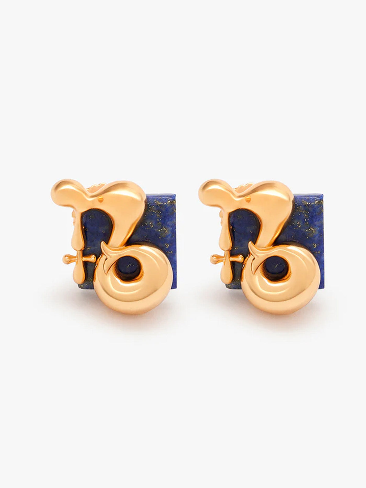 These exquisite studs feature a mystic square of semi-precious lapis lazuli, elegantly adorned with a detailed Capricon zodiac motif. Handcrafted from meticulously moulded brass and luxuriously enveloped in 22k gold, each piece serves as a talisman for your inner spirit. Wear these studs to magnify your brilliance, aligning your essence with cosmic harmony.