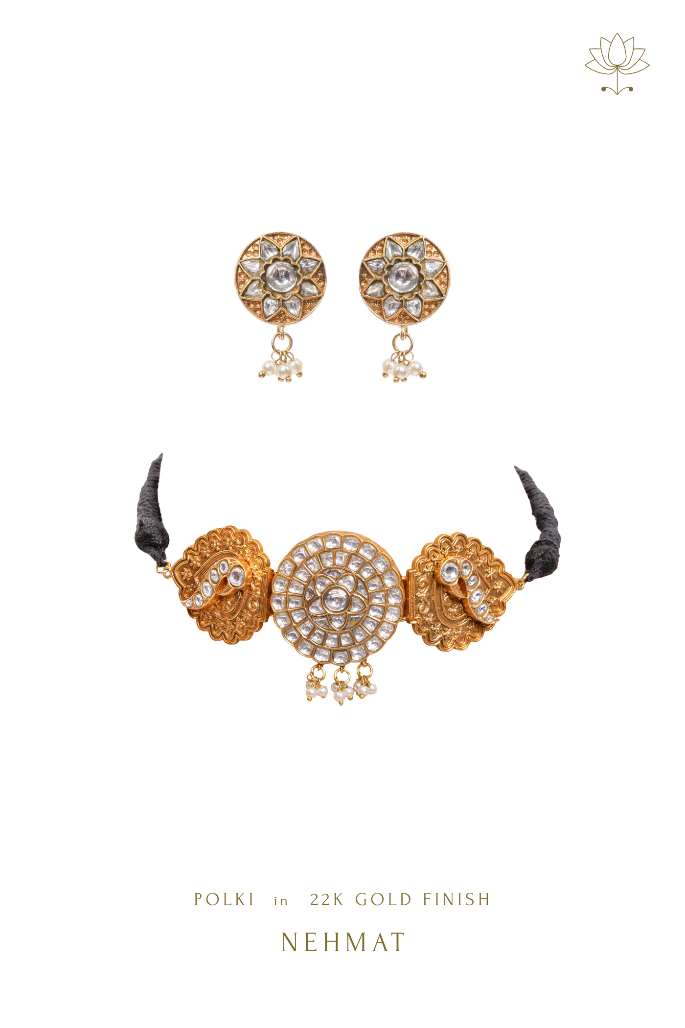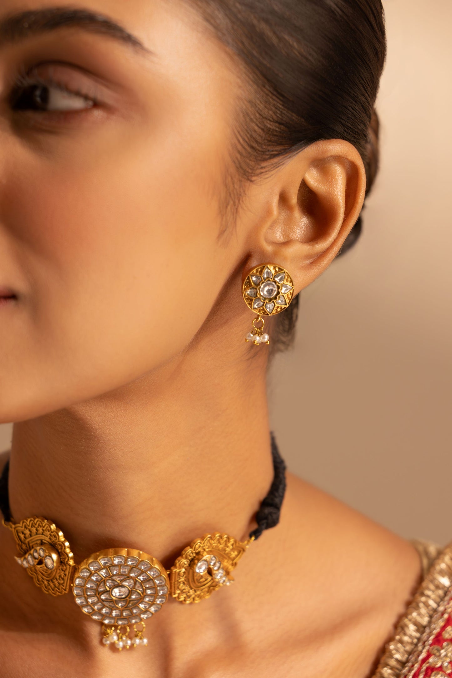 A beautifully handcrafted choker made in an alloy of copper and brass, featuring intricate detailing and uncut Polki stones. The circular motif at the center is accented with delicate pearl drops, adding a touch of timeless elegance. Perfect for pairing with traditional outfits for festive or wedding occasions.