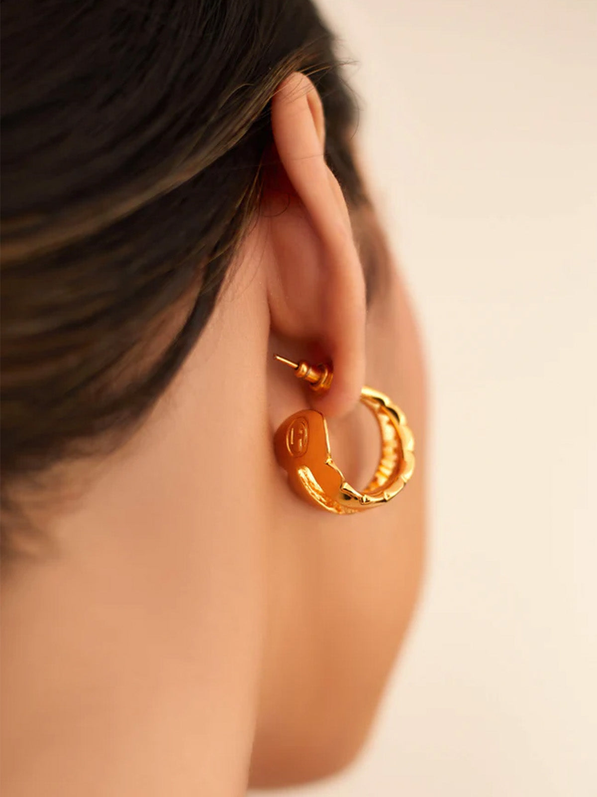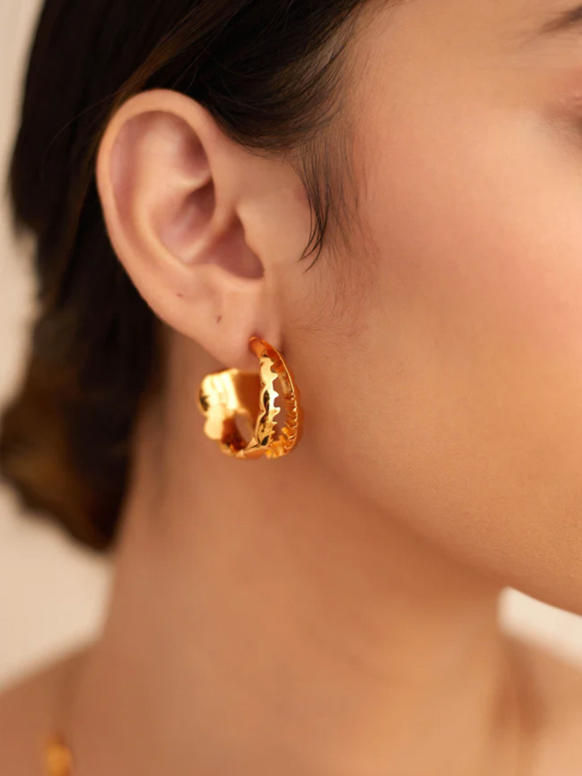 Our Acuti hoop earrings flow confidently as a double hoop with scalloped edges that truly cut through the noise and make a statement. Boasting a fine polish that shines bright gold, this one-of-a-kind design will surely turn heads and warrant a compliment. Or maybe two. Pair these with our Acuti Choker.