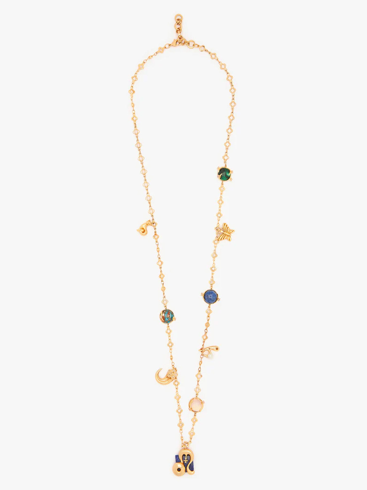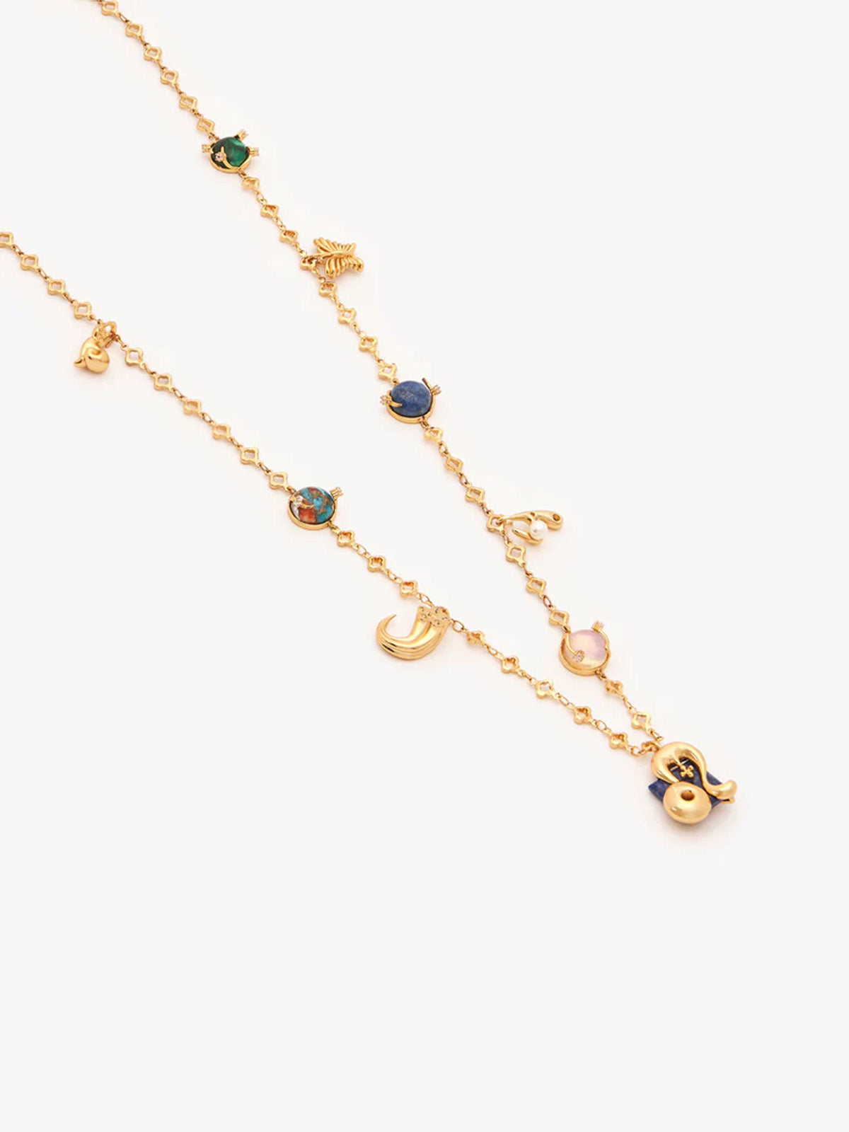 Vintage Celestial Halo Necklace celebrates the alluring accents of the yesteryears, reinterpreted with a chic, contemporary edge.The Leo zodiac motif, set in the semi-precious Lapis Lazuli forms the heart of your piece. Personalise your necklace with exquisite good luck charms that include your fortune number and spirit animals. Accentuated with semi-precious stones such as Malachite, White Opal, and American Turquoise, sparkling cubic zirconia and the OH celestial poppy tusk this necklace exudes a sophisticated charm that mirrors the grandeur of classic aesthetics. Finished in 22k gold .