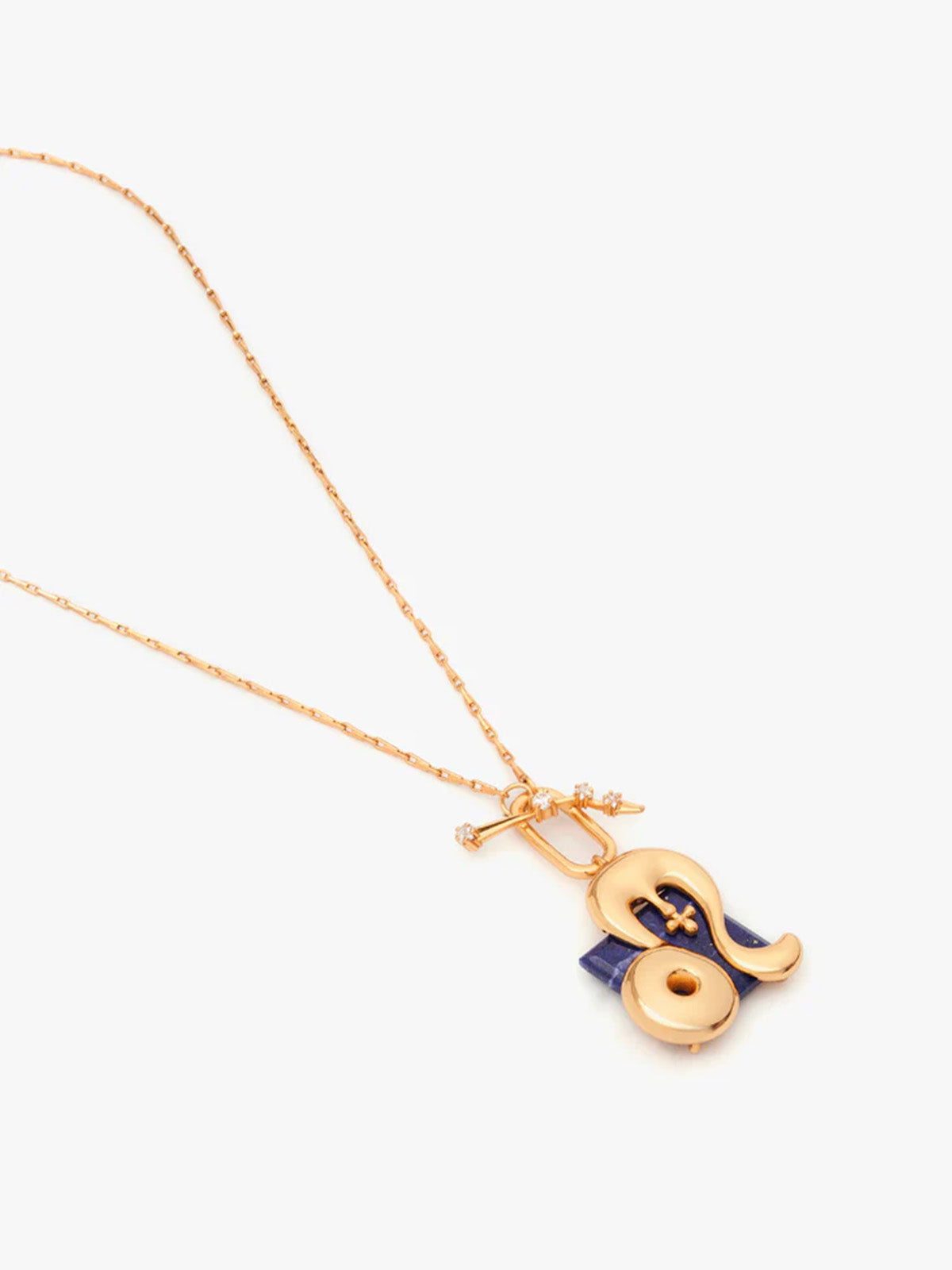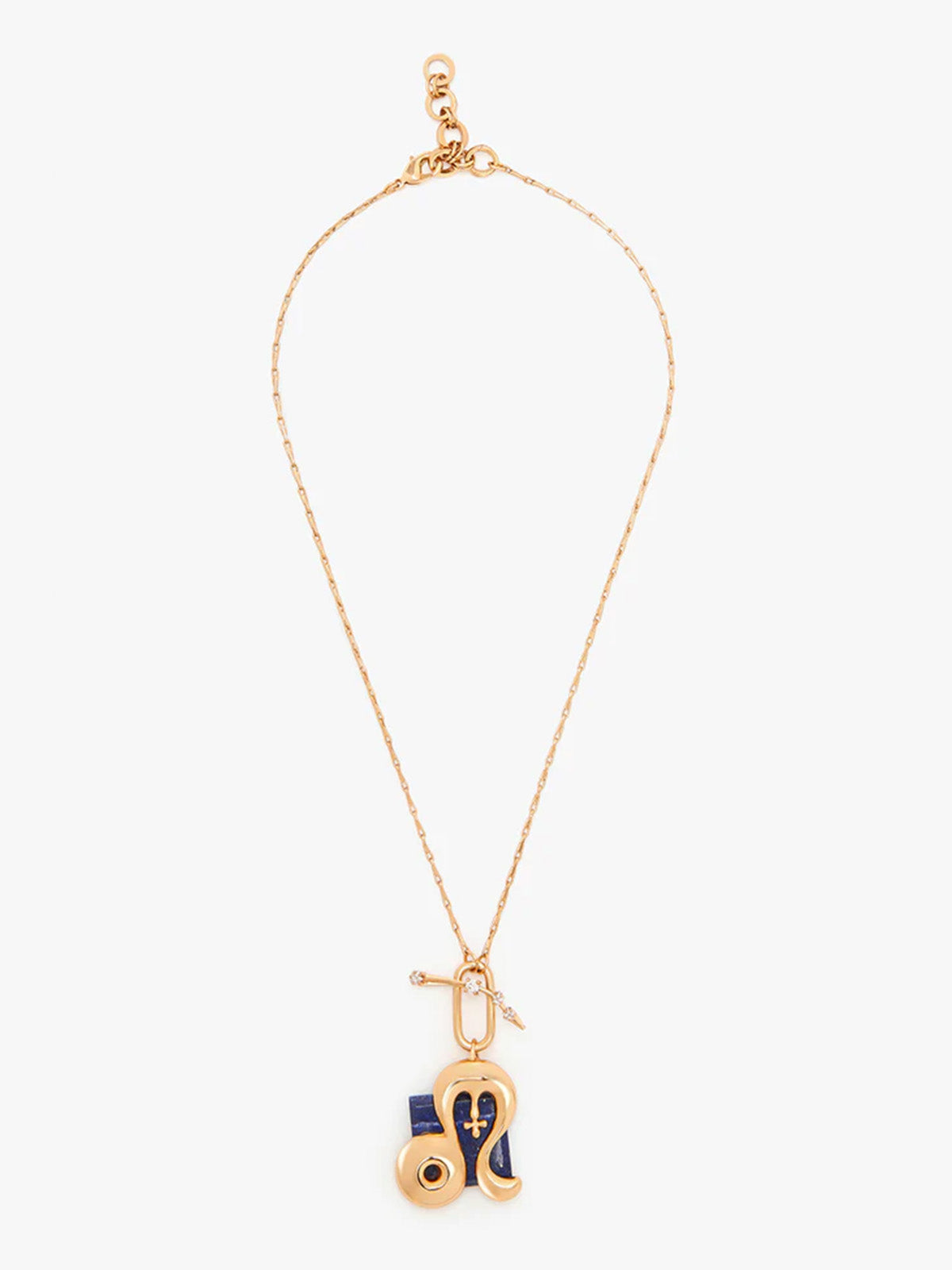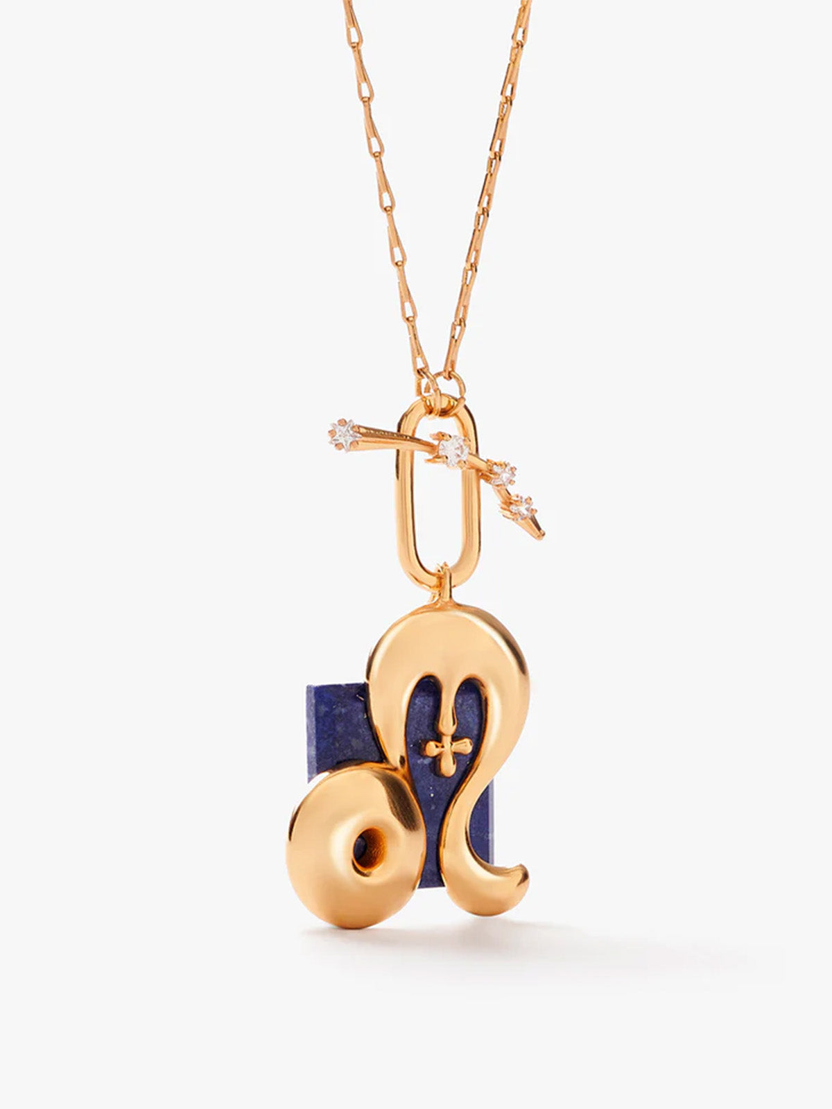 Inspired by the iconic bulbous design of the Lazuli Shroom Head, the Leo Zodiac Pendant is a sculptural masterpiece, paying homage to the house’s passion for astral wonders. At its heart lies an alluring lapis lazuli, while a T-clasp encrusted with sparkling cubic zirconia adds a sophisticated glint. Moulded in brass and plated with 22k gold, this pendant serves as a talisman for your inner brilliance, perfect for any day and every occasion.