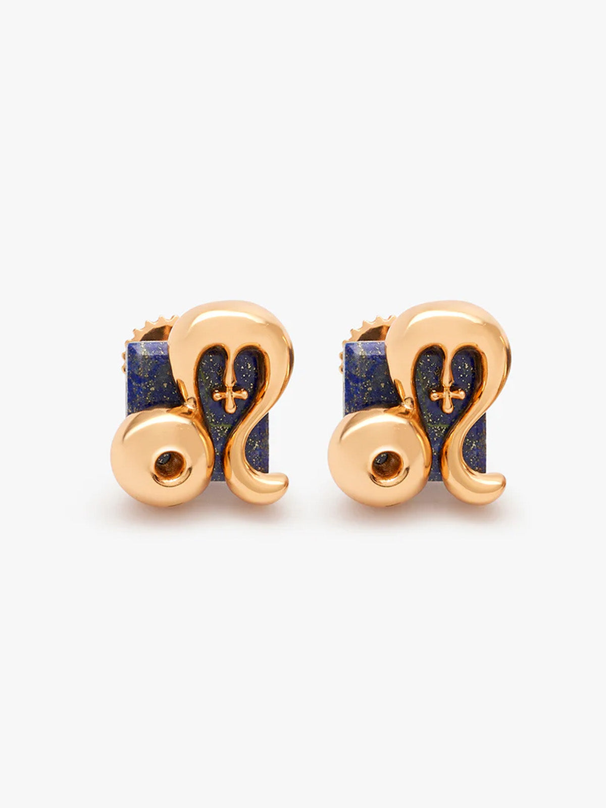 These exquisite studs feature a mystic square of semi-precious lapis lazuli, elegantly adorned with a detailed Leo zodiac motif. Handcrafted from meticulously moulded brass and luxuriously enveloped in 22k gold, each piece serves as a talisman for your inner spirit. Wear these studs to magnify your brilliance, aligning your essence with cosmic harmony.