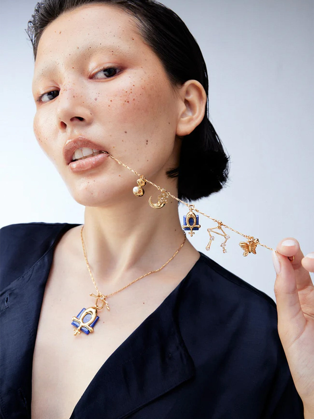 Inspired by the iconic bulbous design of the Lazuli Shroom Head, the Libra Zodiac Pendant is a sculptural masterpiece, paying homage to the house’s passion for astral wonders. At its heart lies an alluring lapis lazuli, while a T-clasp encrusted with sparkling cubic zirconia adds a sophisticated glint. Moulded in brass and plated with 22k gold, this pendant serves as a talisman for your inner brilliance, perfect for any day and every occasion.