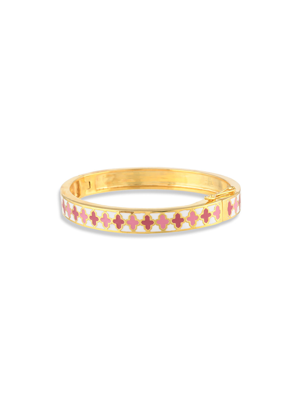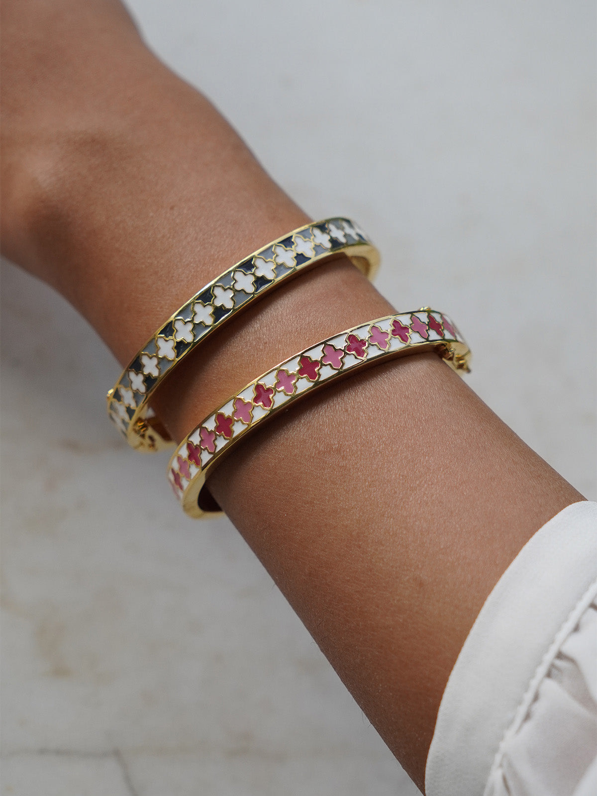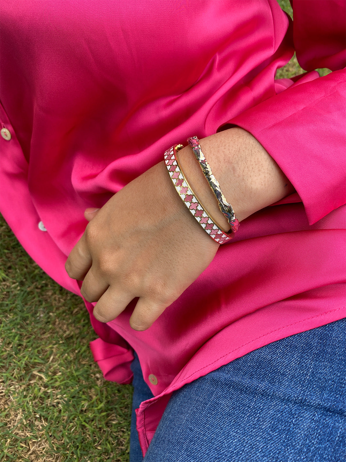 Inspired by mosaic patterns, colors, and calligraphy in Spanish architecture, the Andalusia collection offers everyday jewelry pieces that amplify this inspiration. Enamel work brings the vibrant color palette to life in each design. These reversible pieces, including a daily wear gold bracelet, can be stacked together or worn individually, creating complementary patterns.