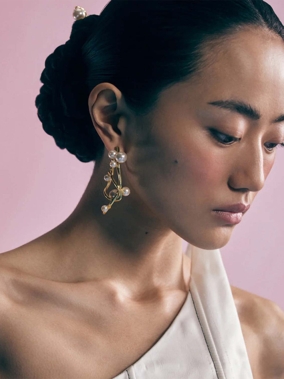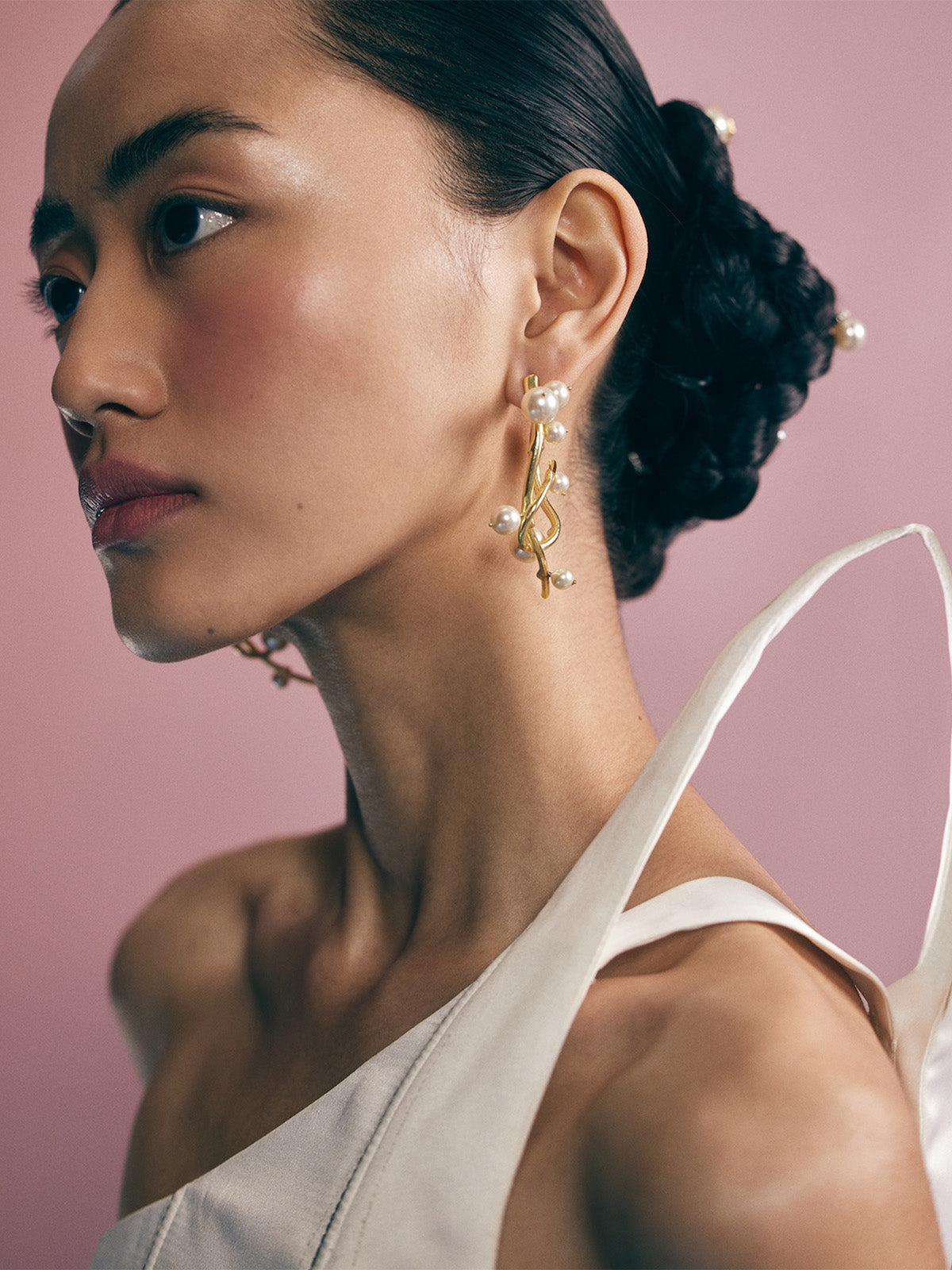 Rosée de café (meaning "Dew on Coffee") draws its inspiration from the coffee plantations in Coorg. It features glistening pearls and intricate gold designs abstracting the form of coffee berries. This collection is well suited for occasions demanding elaborate designs but where you don’t want to go with the commonplace!