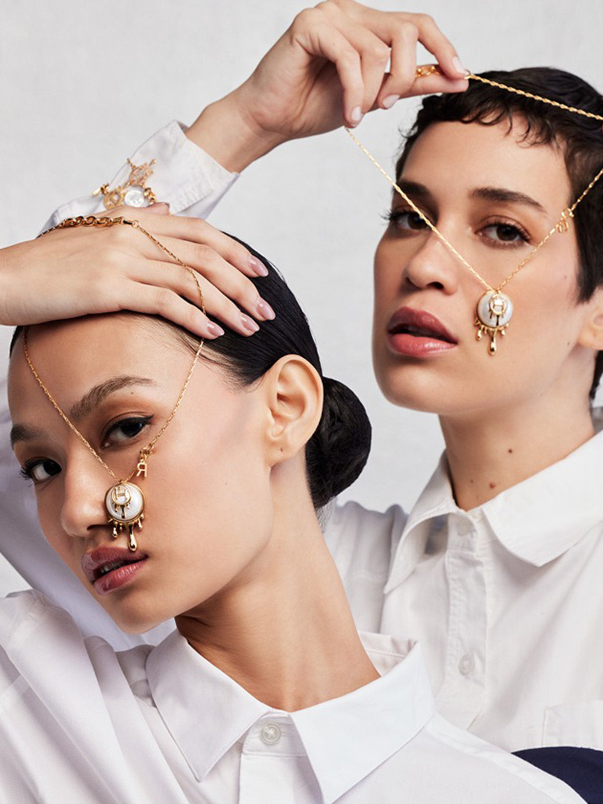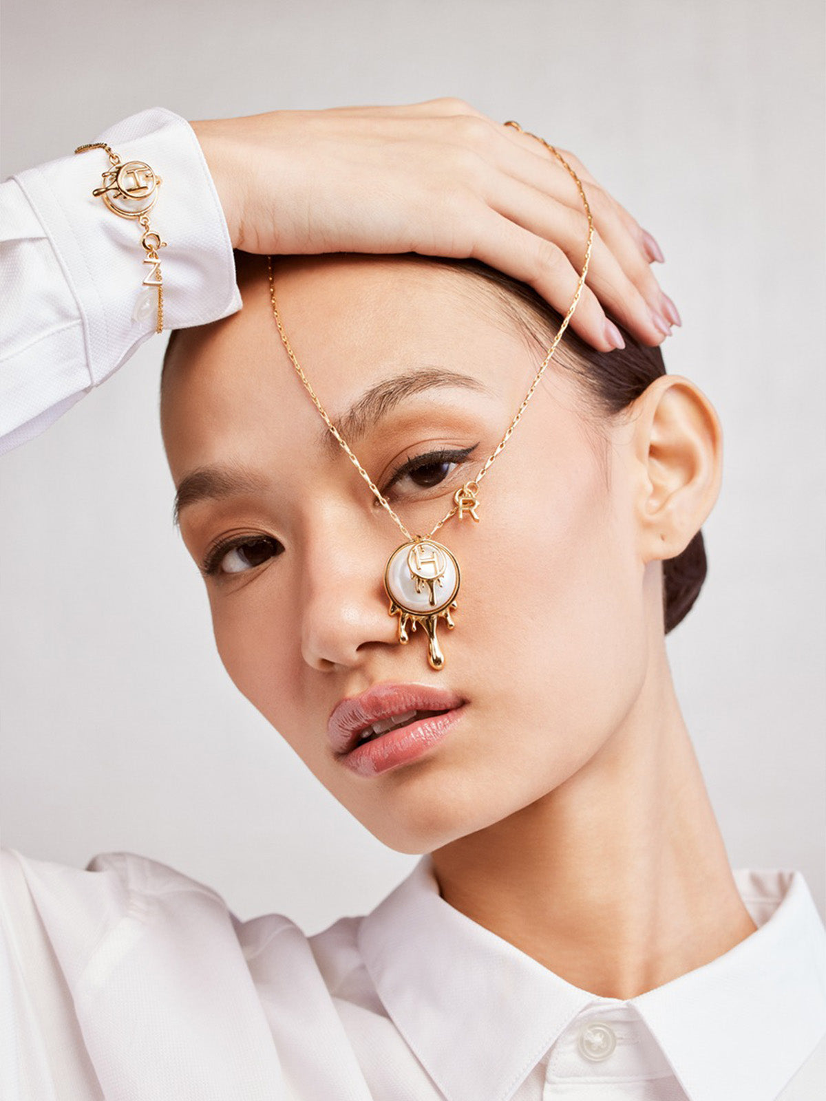 Adding elegance to any attire, the (name) is the result of meticulous craftsmanship. A natural semi-precious pearl is delicately embed in the House's Drip OH silhouette. Personalize it with your initial and style the 22k gold-plated effortlessly everywhere.