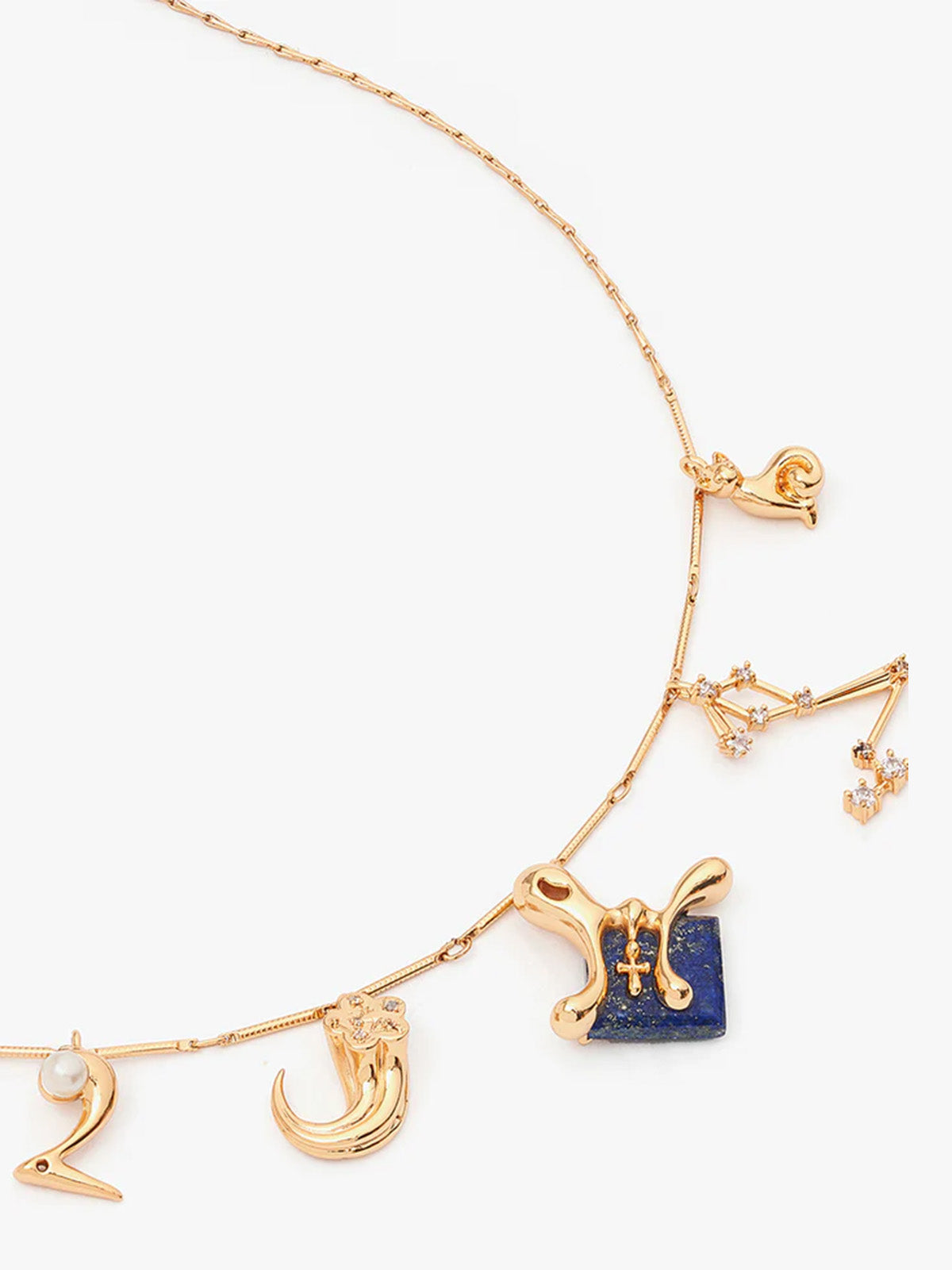 Craft your own celestial story with a bespoke cosmic masterpiece that allows you to weave your own universe. The Pisces zodiac motif, set in the semi-precious Lapis Lazuli and paired with the Pisces constellation charm, forms the heart of your piece. Personalise it with exquisite good luck charms, including your fortune number, guiding spirit animal, and additional celestial constellations, elegantly embellished with the OH celestial poppy tusk. Meticulously handcrafted, these delicate charms are designed to encapsulate your elegance and individuality. Finished in 22k gold.