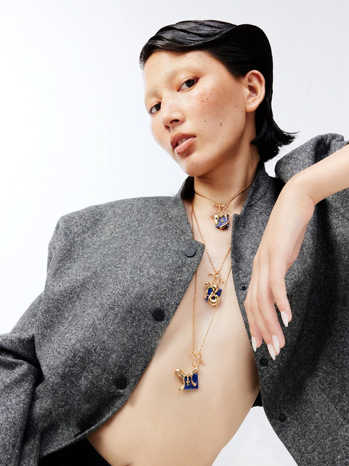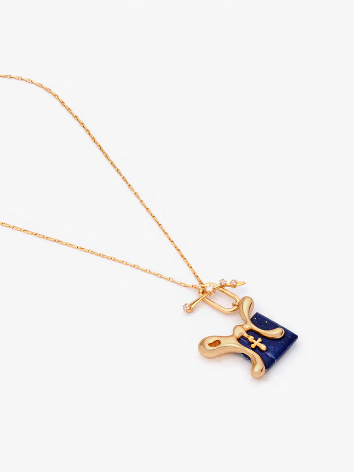 Inspired by the iconic bulbous design of the Lazuli Shroom Head, the Pisces Zodiac Pendant is a sculptural masterpiece, paying homage to the house’s passion for astral wonders. At its heart lies an alluring lapis lazuli, while a T-clasp encrusted with sparkling cubic zirconia adds a sophisticated glint. Moulded in brass and plated with 22k gold, this pendant serves as a talisman for your inner brilliance, perfect for any day and every occasion.