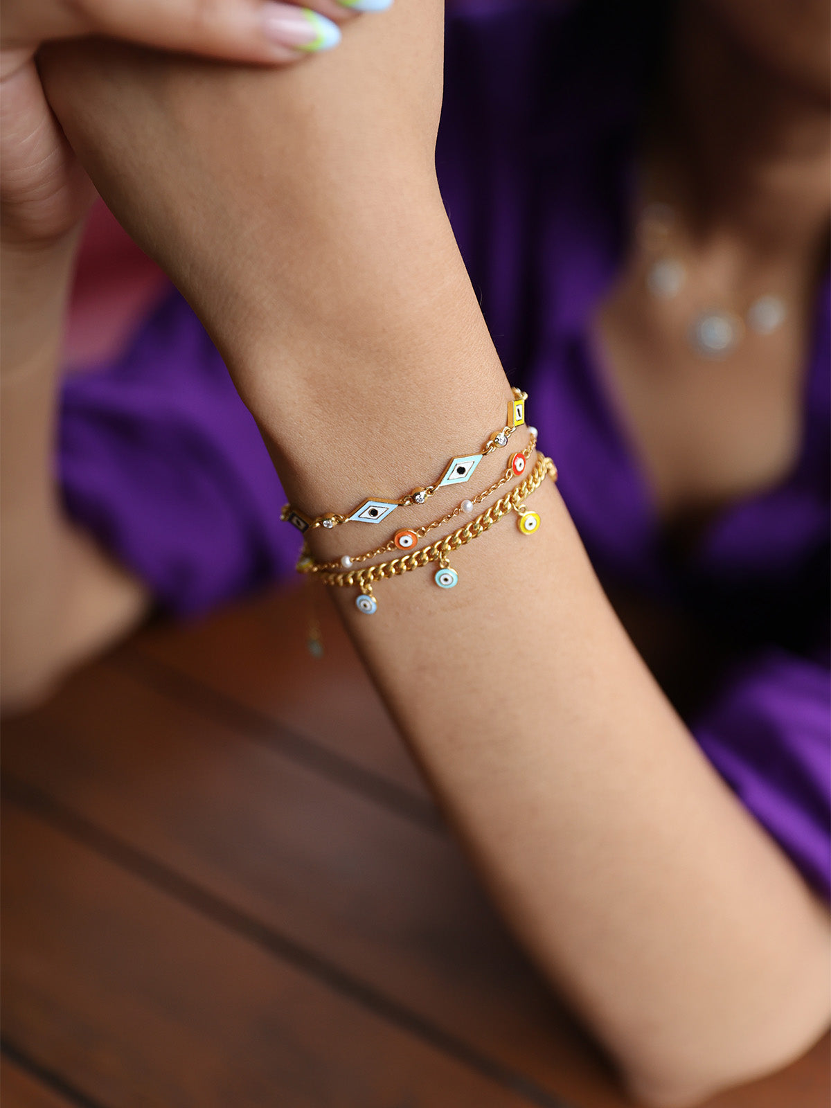 The Evil Eye Collection is our take on classic jewellery transformed with bold hues. Make sure you get your stack game on for that extra drama!