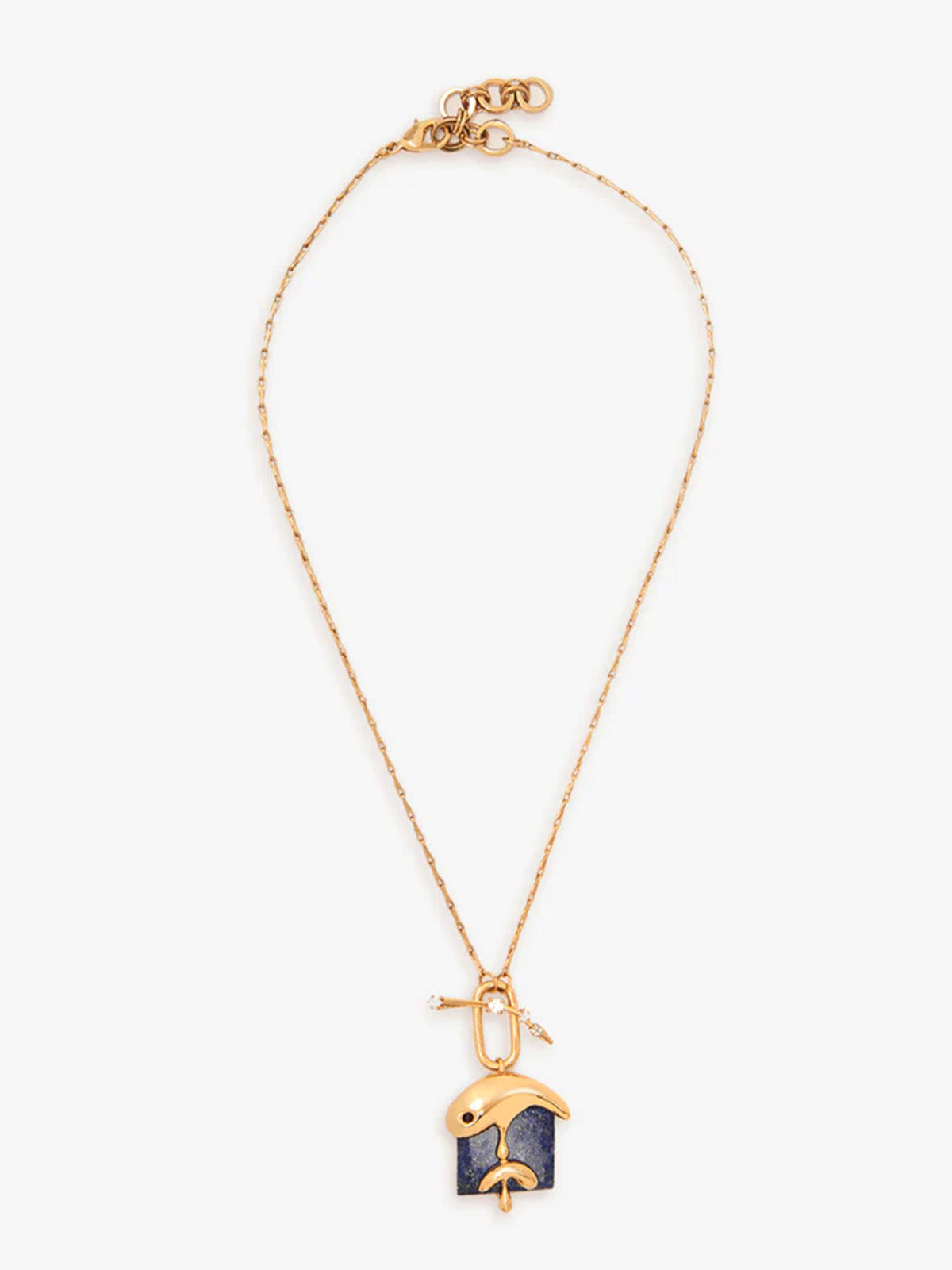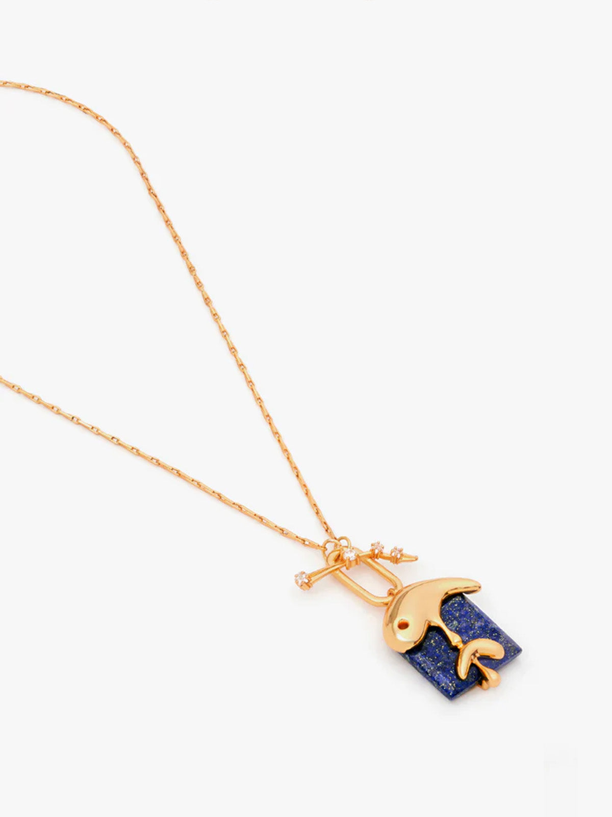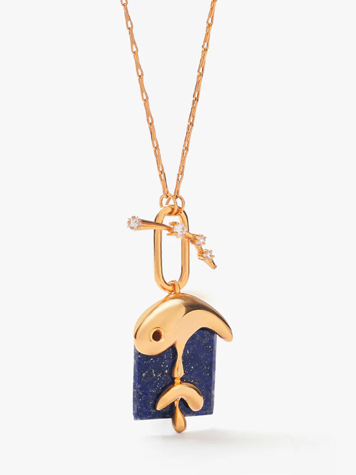 Inspired by the iconic bulbous design of the Lazuli Shroom Head, the Sagittarius Zodiac Pendant is a sculptural masterpiece, paying homage to the house’s passion for astral wonders. At its heart lies an alluring lapis lazuli, while a T-clasp encrusted with sparkling cubic zirconia adds a sophisticated glint. Moulded in brass and plated with 22k gold, this pendant serves as a talisman for your inner brilliance, perfect for any day and every occasion.