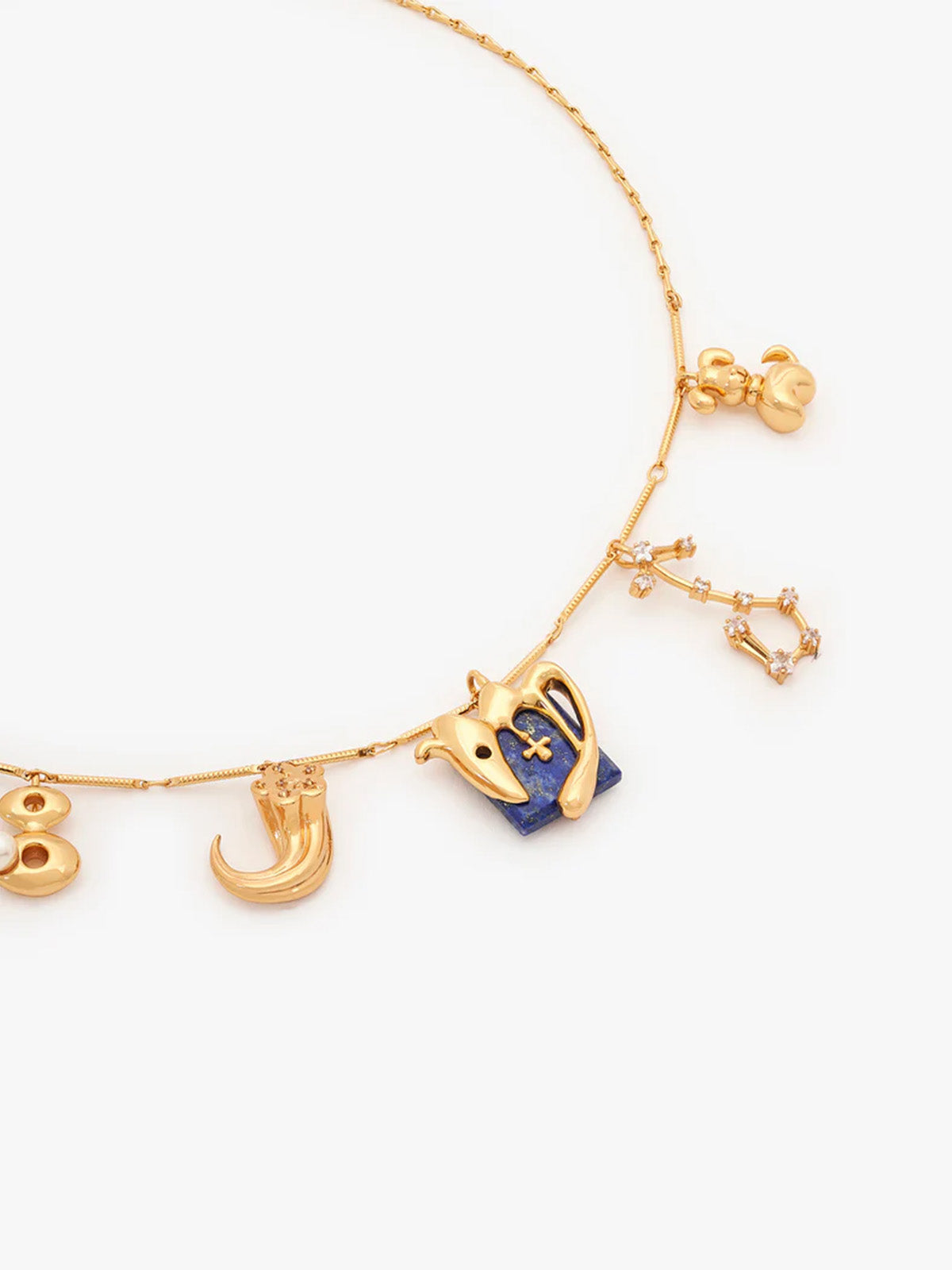 Craft your own celestial story with a bespoke cosmic masterpiece that allows you to weave your own universe. The Scorpio zodiac motif, set in the semi-precious Lapis Lazuli and paired with the Scorpio constellation charm, forms the heart of your piece. Personalise it with exquisite good luck charms, including your fortune number, guiding spirit animal, and additional celestial constellations, elegantly embellished with the OH celestial poppy tusk. Meticulously handcrafted, these delicate charms are designed to encapsulate your elegance and individuality. Finished in 22k gold.
