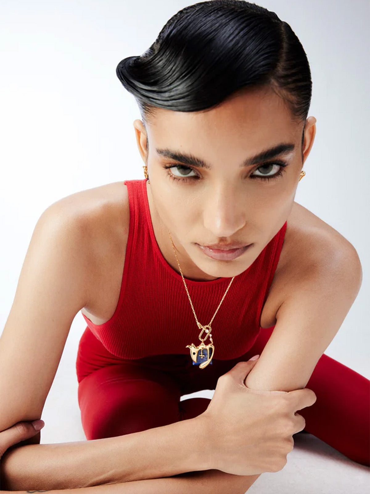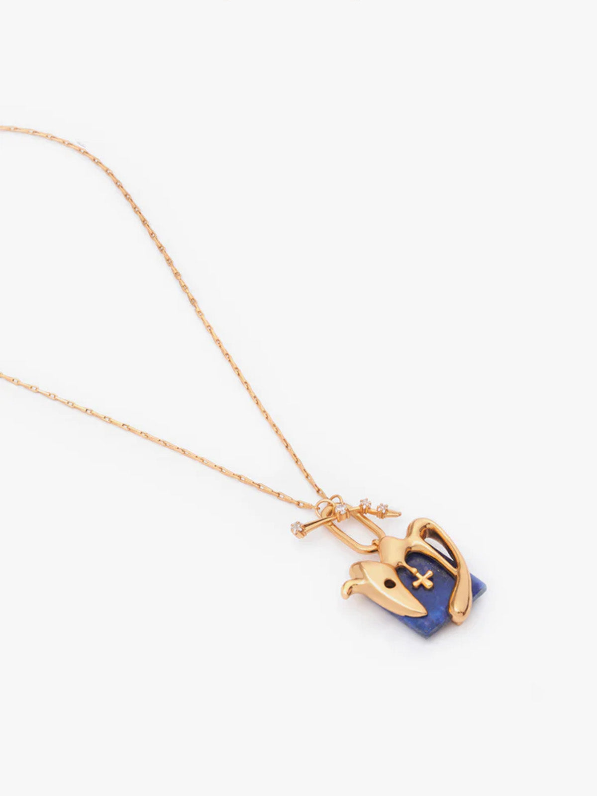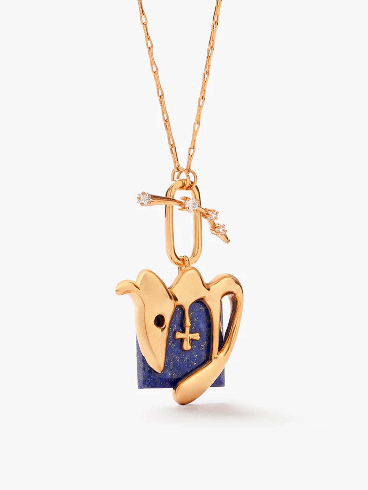 Inspired by the iconic bulbous design of the Lazuli Shroom Head, the Scorpio Zodiac Pendant is a sculptural masterpiece, paying homage to the house’s passion for astral wonders. At its heart lies an alluring lapis lazuli, while a T-clasp encrusted with sparkling cubic zirconia adds a sophisticated glint. Moulded in brass and plated with 22k gold, this pendant serves as a talisman for your inner brilliance, perfect for any day and every occasion.