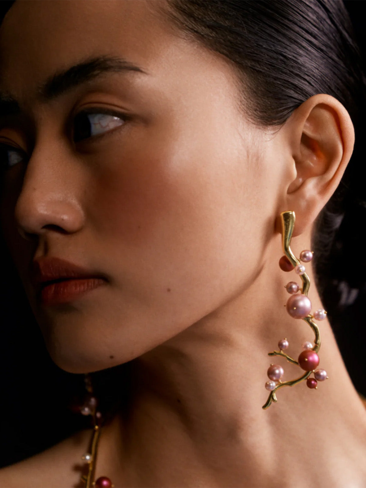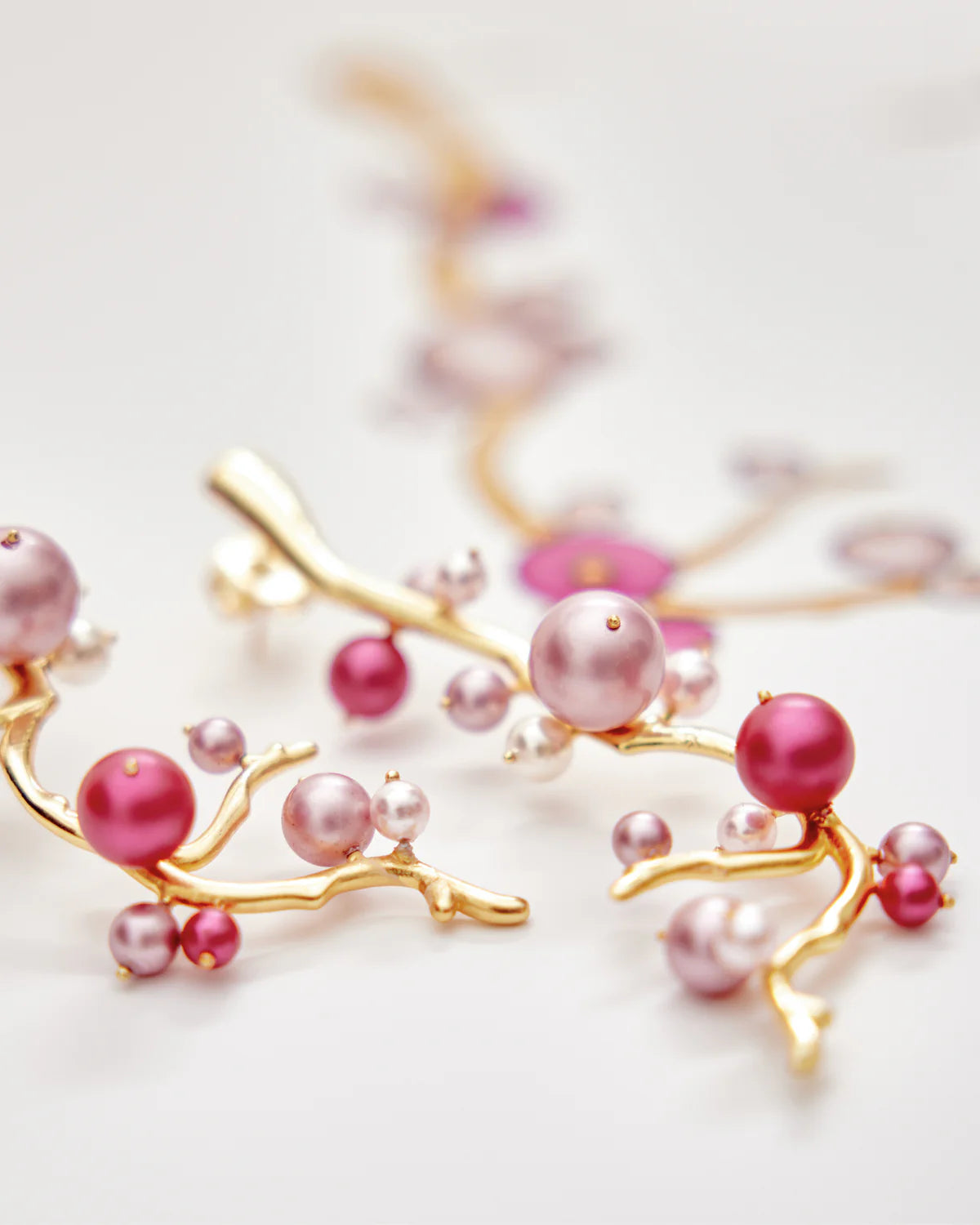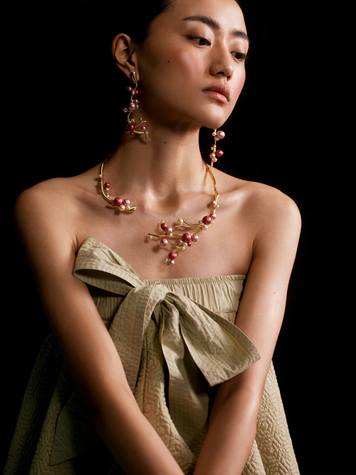 Rosée de café (meaning "Dew on Coffee") draws its inspiration from the coffee plantations in Coorg. It features glistening pearls and intricate gold designs abstracting the form of coffee berries. This collection is well suited for occasions demanding elaborate designs but where you don’t want to go with the commonplace!