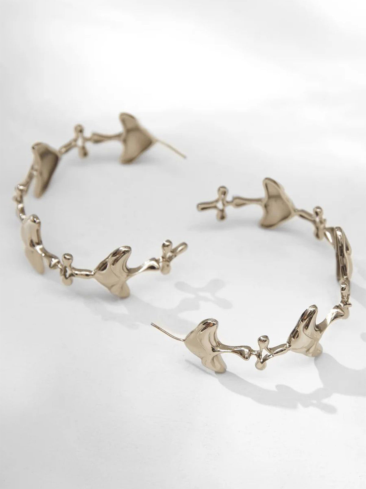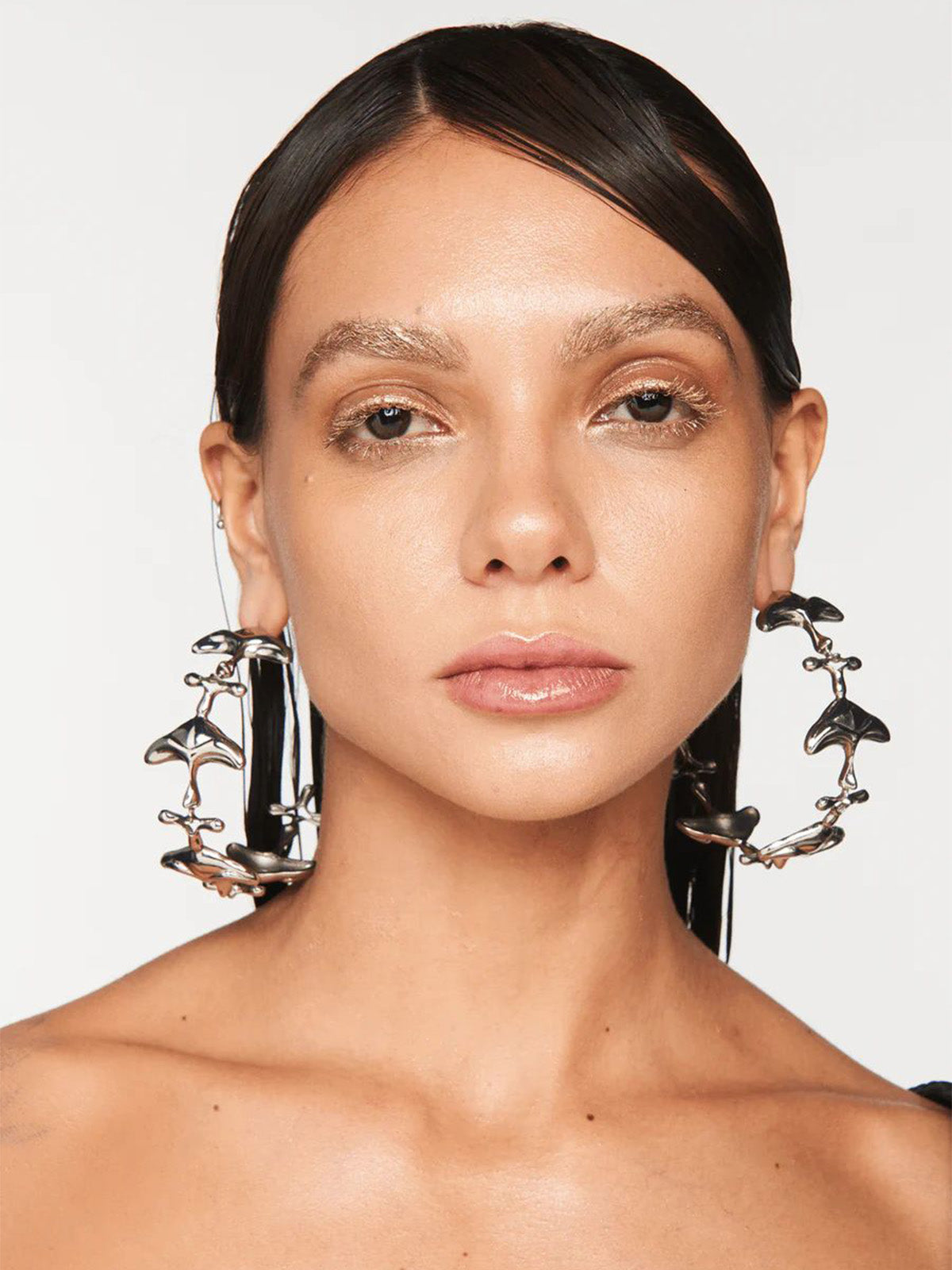 A redefined edition of the classic hoops, the Shroomhead hoops are cast in 22 KT silver plating in a new iconic shape. A raw industrial aesthetic is merged with an edgy essence that elevates a modern design statement. An incredible illusion of angular design, the hoops can also be layered with dynamic dainty studs to create an exceptional voluminous effect.