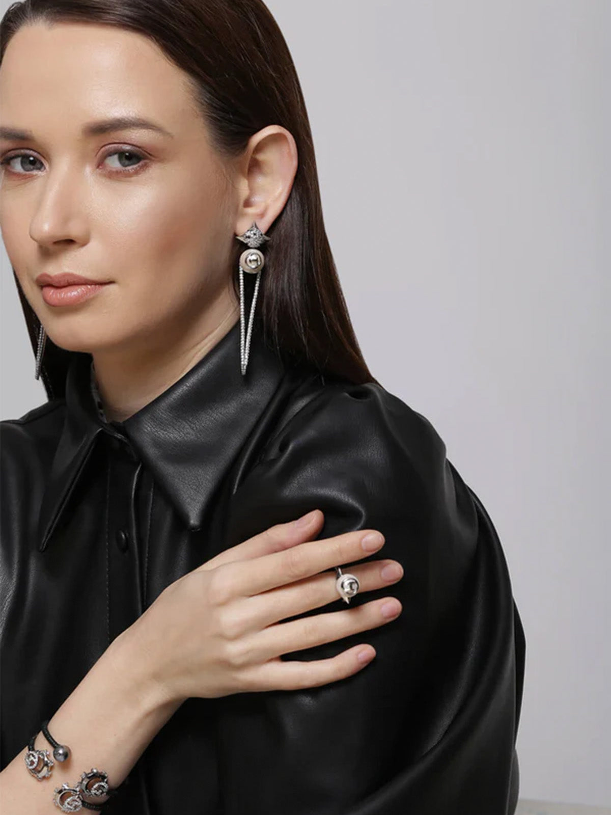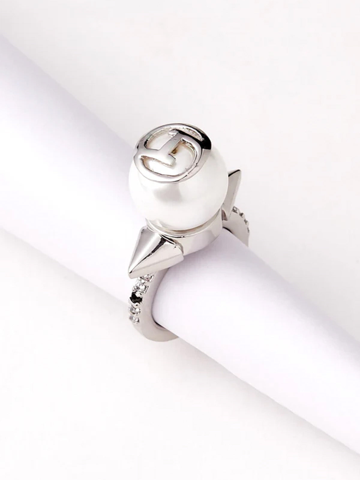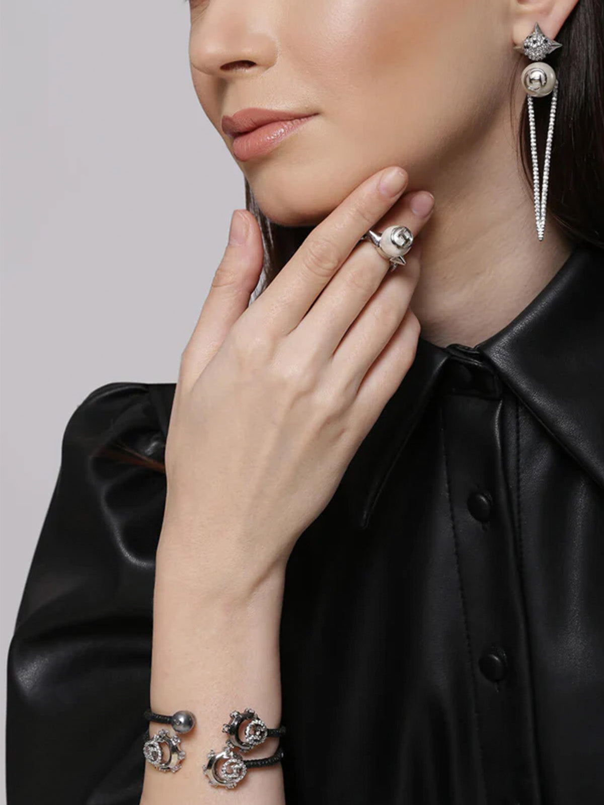 Capturing the essence of iconic Outhouse jewellery, the OH Celeste Nova Ring is minimal and uniquely expressive. Embellished with ivory Swarovski pearls, the designer ring radiates an aura of engimatic style.