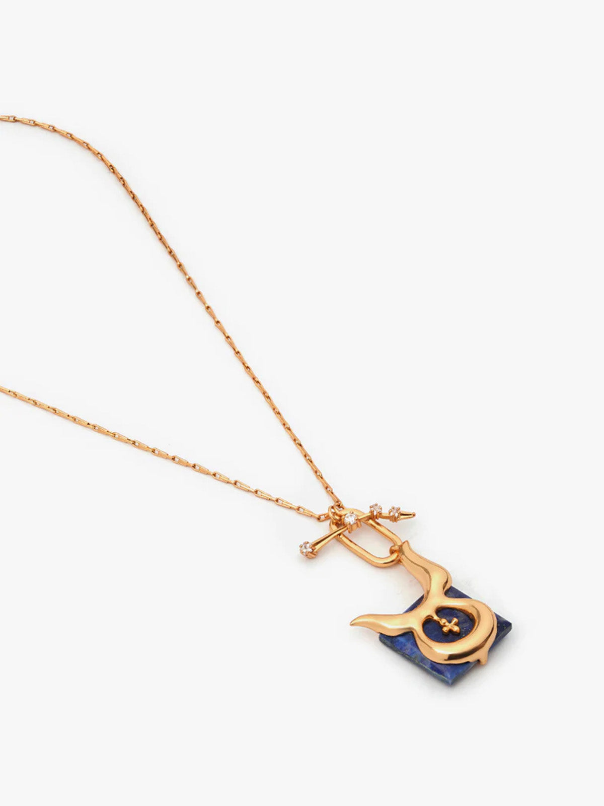 Inspired by the iconic bulbous design of the Lazuli Shroom Head, the Taurus Zodiac Pendant is a sculptural masterpiece, paying homage to the house’s passion for astral wonders. At its heart lies an alluring lapis lazuli, while a T-clasp encrusted with sparkling cubic zirconia adds a sophisticated glint. Moulded in brass and plated with 22k gold, this pendant serves as a talisman for your inner brilliance, perfect for any day and every occasion.