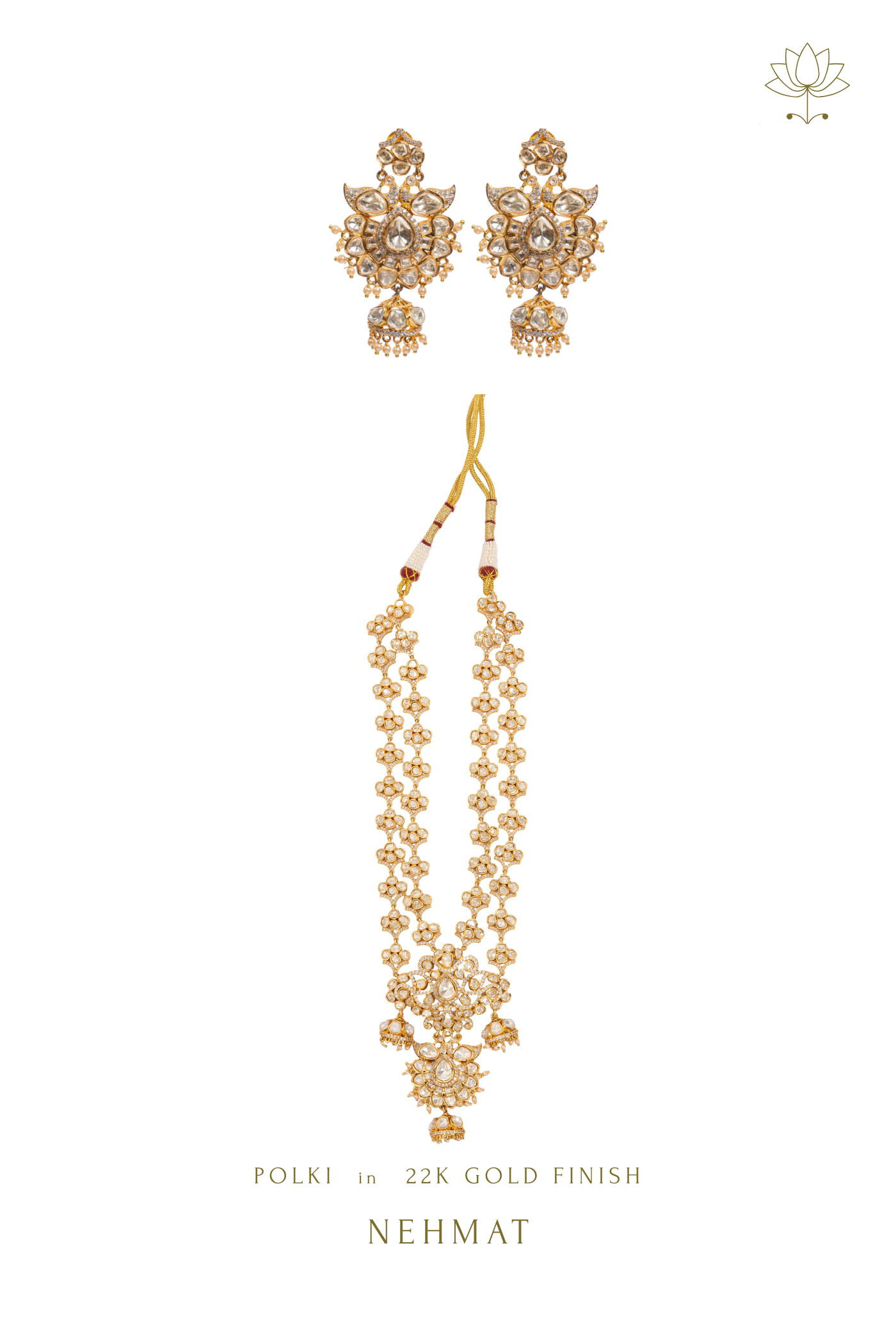 Graceful, ornate, and steeped in heritage — The Nityara Necklace Set glows with divine luminosity. Handcrafted in a warm copper-brass alloy, its cascading floral motifs shimmer with Moissanite brilliance, outlined in delicate Zirconia halos. Inspired by temple artistry yet made for modern celebrations, this long necklace evokes the grandeur of heirloom jewels — a piece that feels eternal, radiant, and royally feminine.
