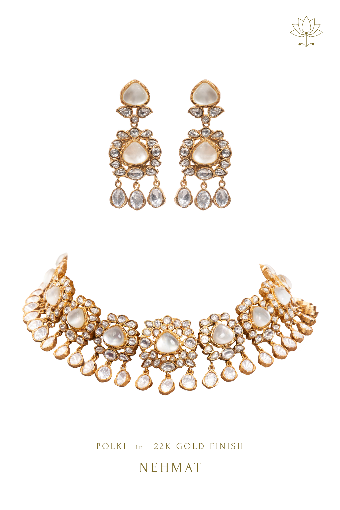 Soft as moonlight, The Noor-e-Moti Choker captures the glow of tradition with a touch of serene modernity. Each petal-shaped Mother of Pearl is encircled with hand-set Polki, creating a gentle rhythm of shimmer and sophistication. Crafted in a warm copper-brass alloy, this piece celebrates quiet grandeur — perfect for the bride who loves timeless elegance wrapped in subtle luminosity.