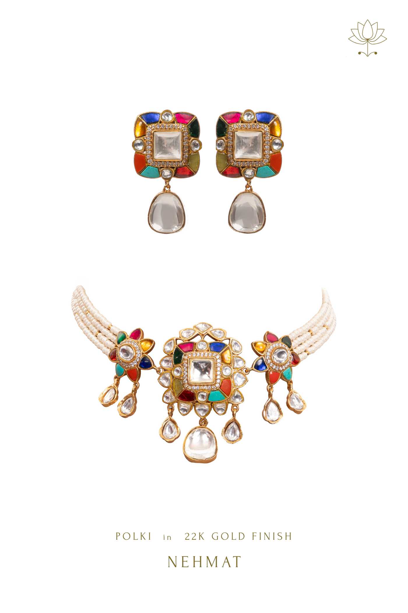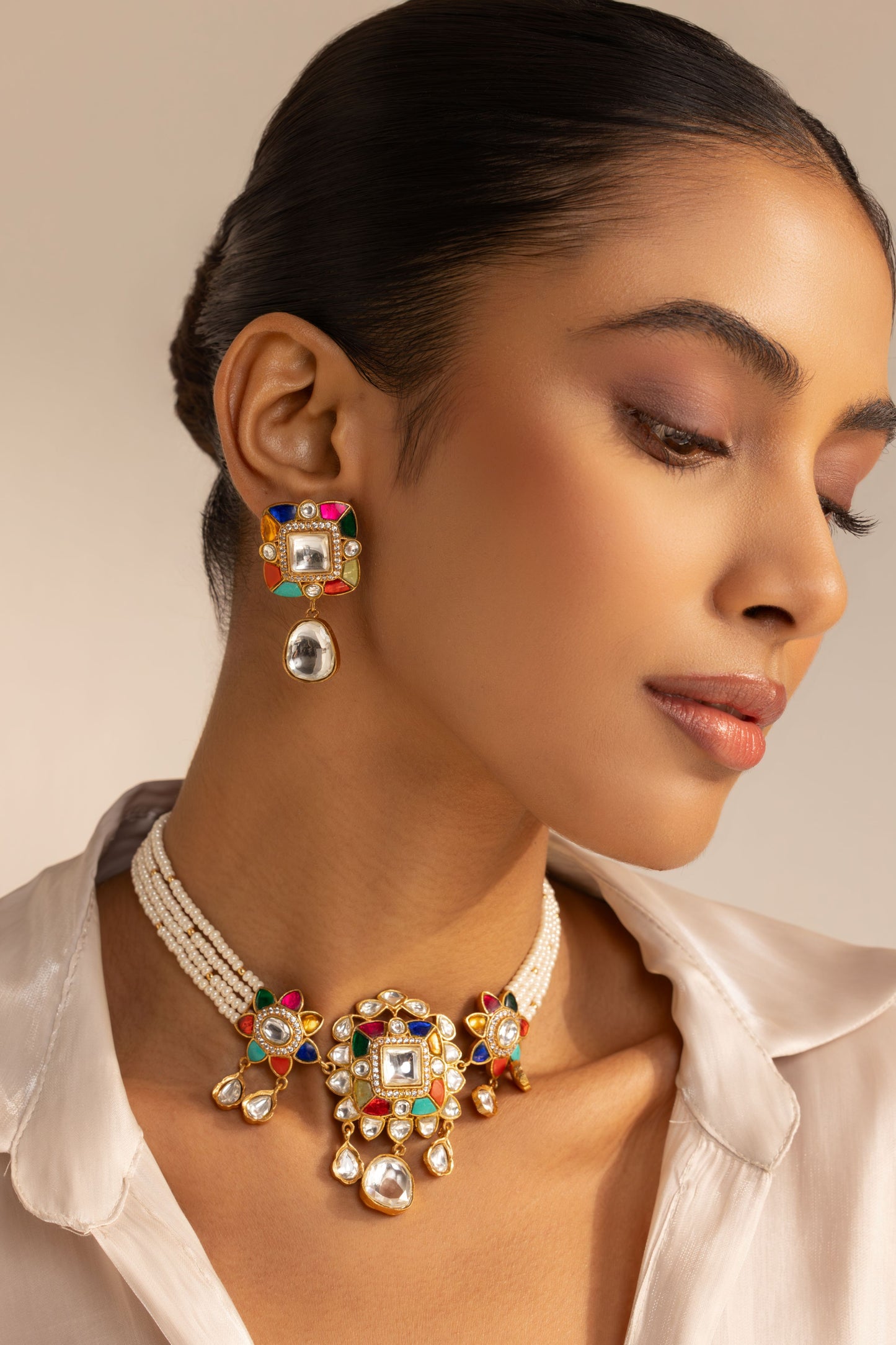 A tribute to India’s palace artistry, The Rang Mahal Choker celebrates colour and craft in its most regal form. Hand-enameled in jewel tones and set with radiant Polki stones, the piece comes alive against strands of delicate pearls and the soft shimmer of Zirconia. Crafted in a warm copper-brass alloy, it tells a story of tradition retold through modern eyes — timeless, festive, and breathtakingly detailed.