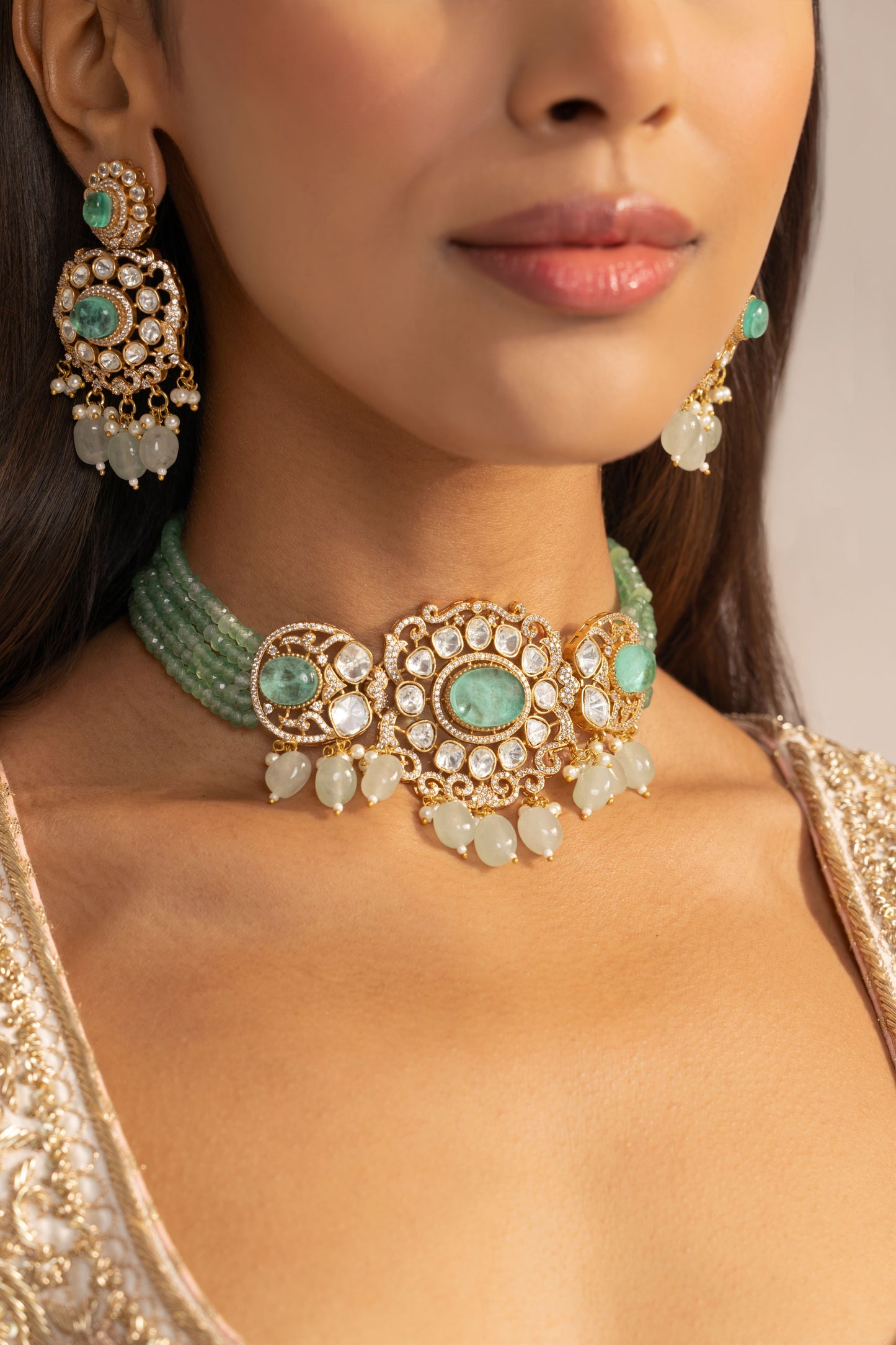 Inspired by the lush grandeur of royal courts, The Royal Verdure Choker glows with vintage opulence. Handcrafted in a warm copper-brass alloy, the piece marries old-world Polki shimmer with the soft translucence of green doublet stones. Tiny Zirconia crystals lend a modern sparkle, while strands of emerald-hued beads trace the neckline with quiet elegance. A timeless piece that whispers tradition but shines with today’s sophistication.