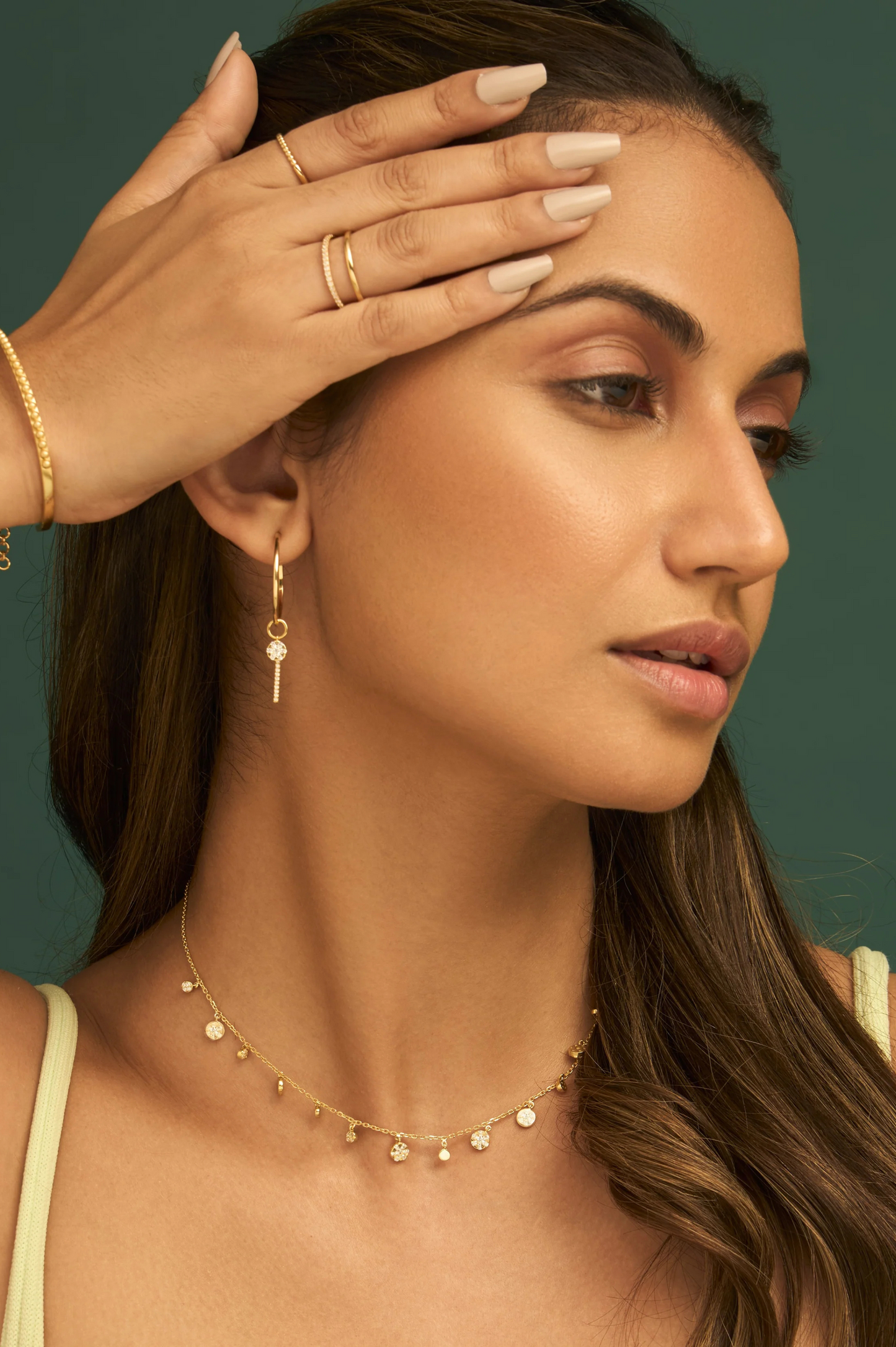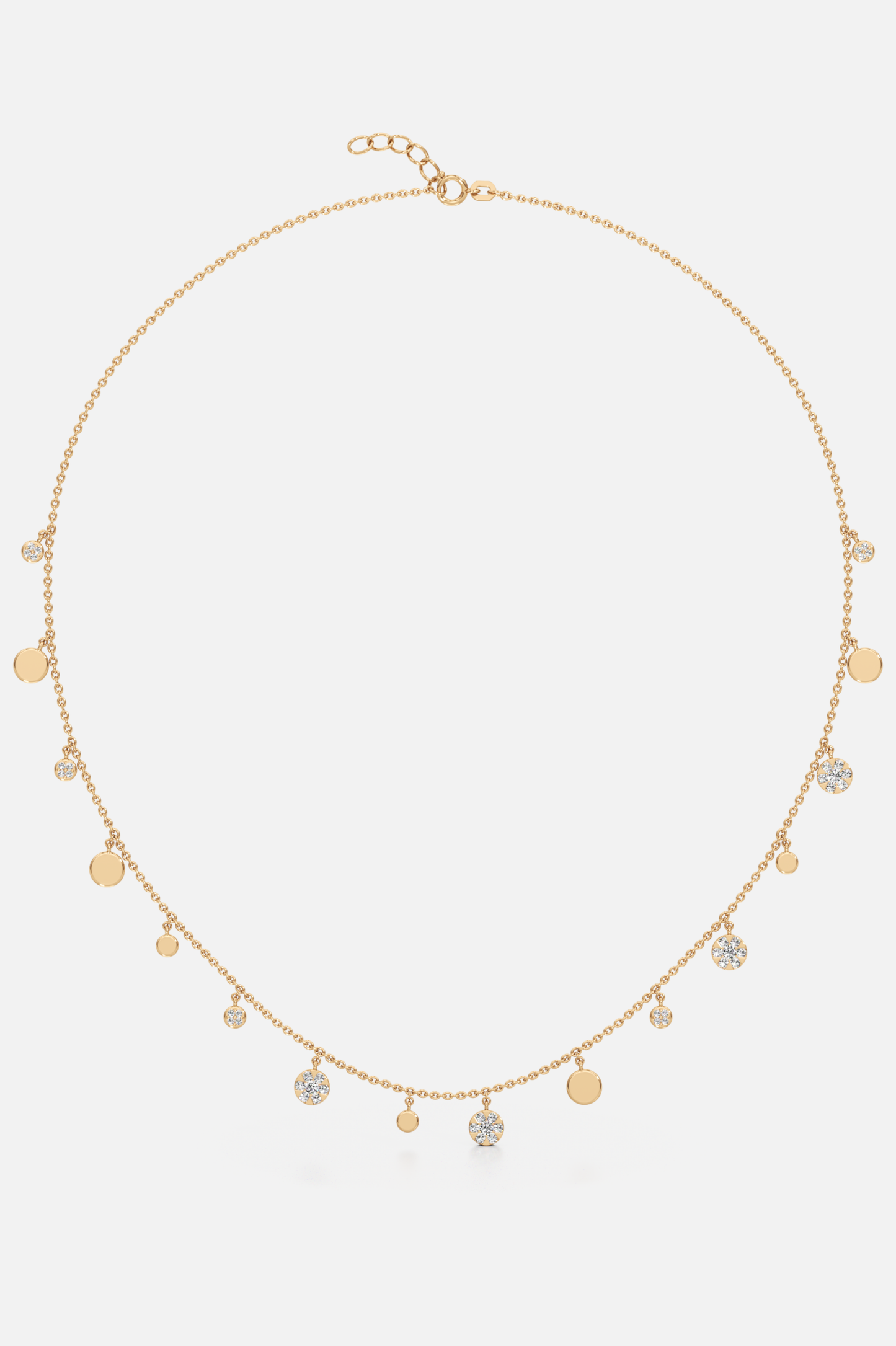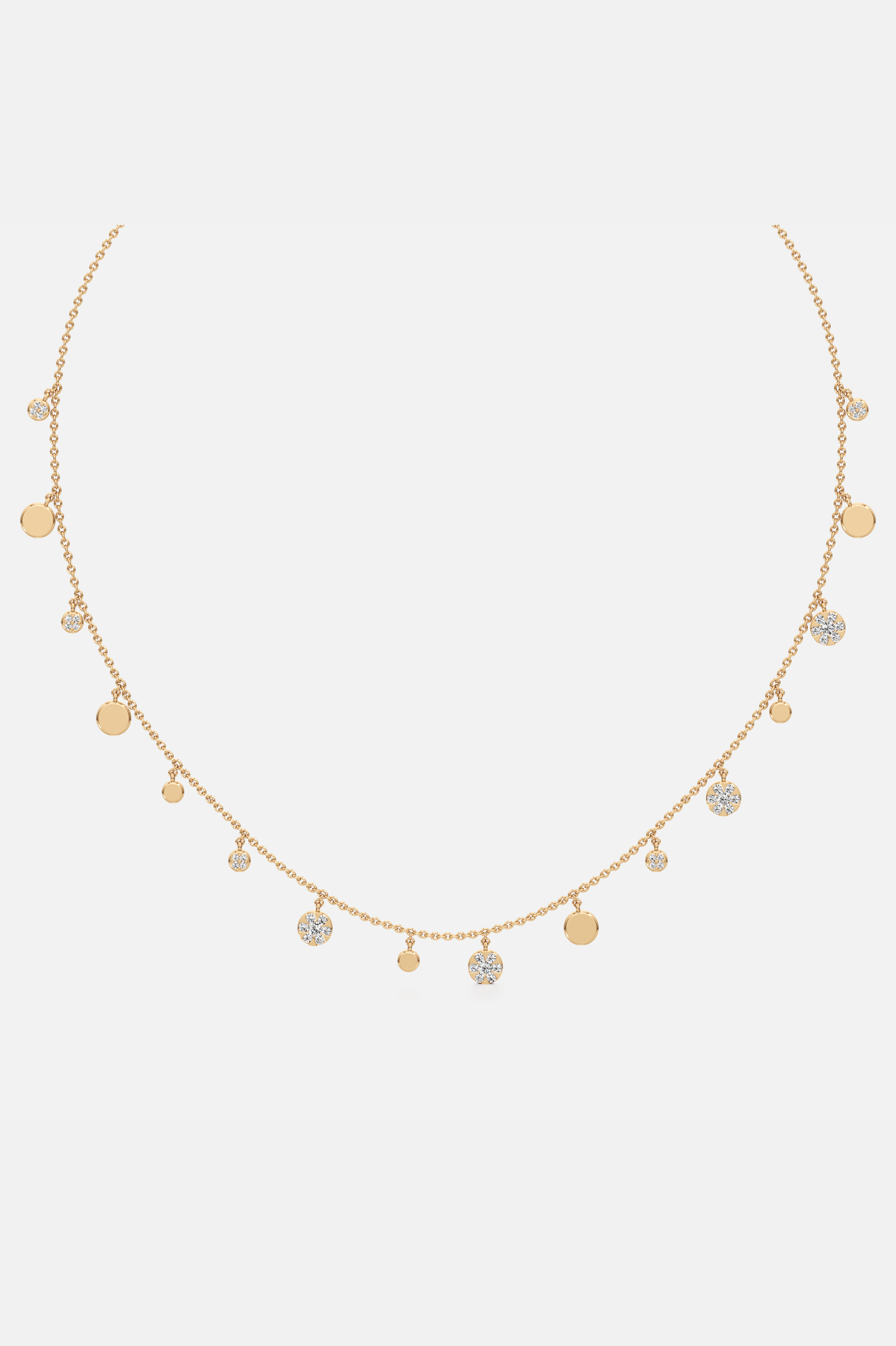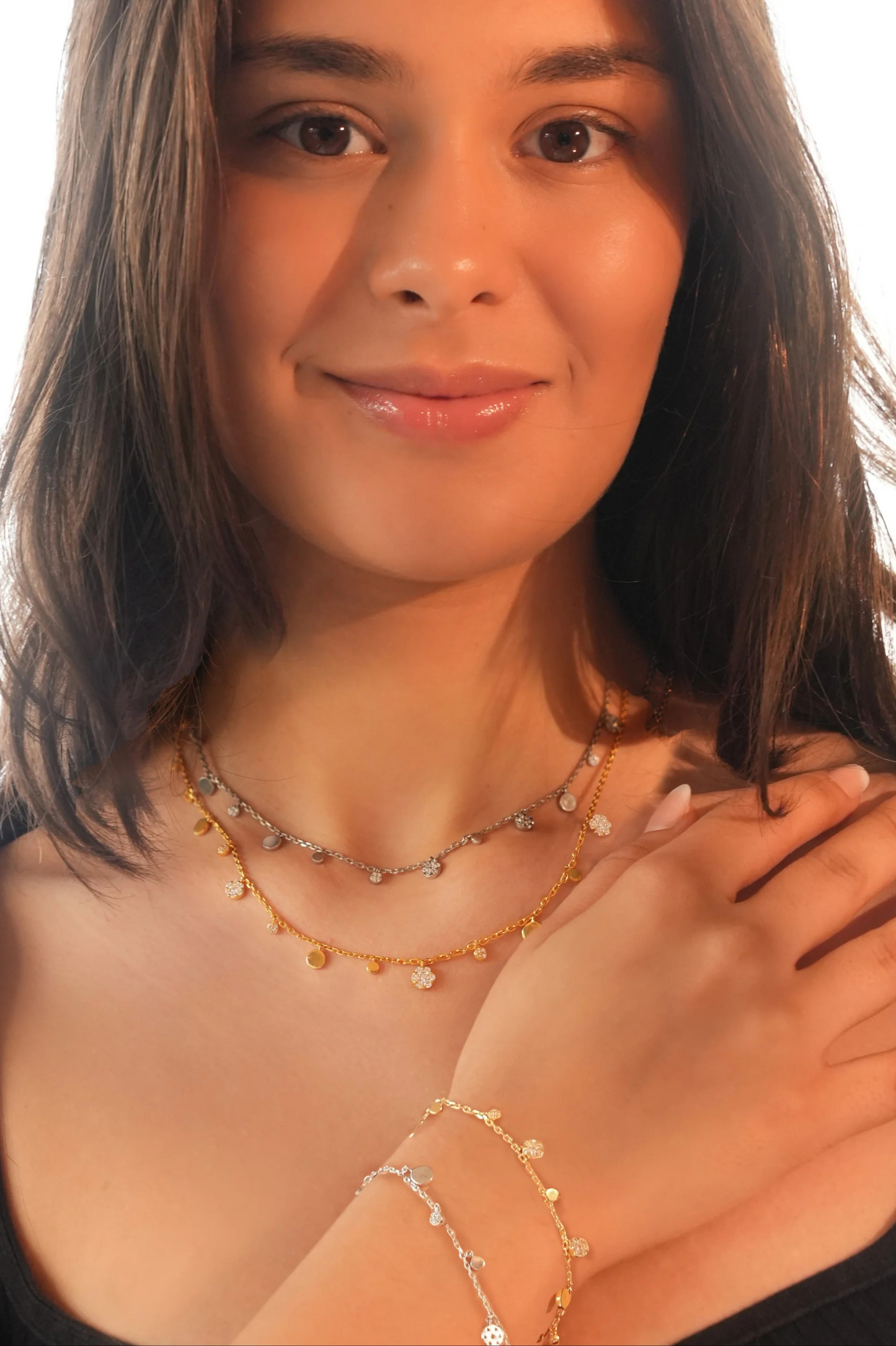 Introducing our Circe Dangle Necklace where each piece features a mesmerizing array of dangling round charms, varying in size and adorned with both sparkling CZ stones and sleek metal accents. Alluring and elegant, this necklace adds a touch of magic to any ensemble. Pair it with our Circe Dangle Bracelet for a coordinated look that exudes elegance and sophistication.