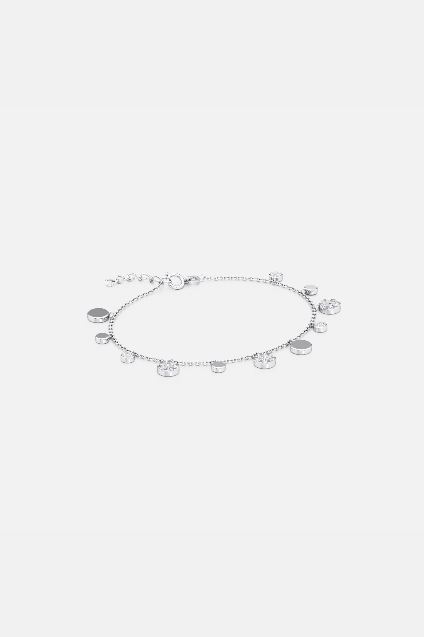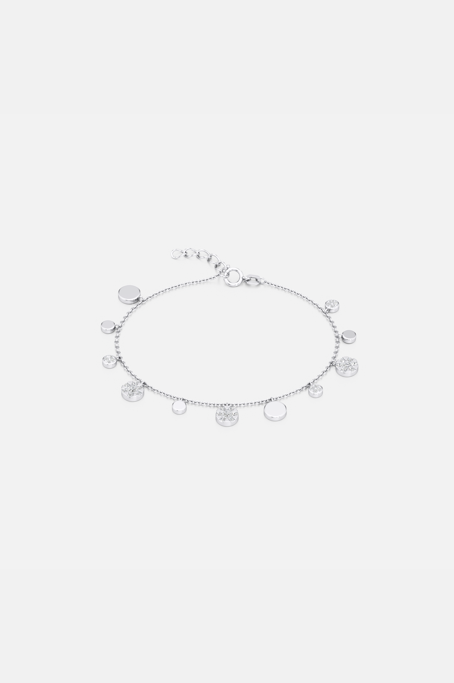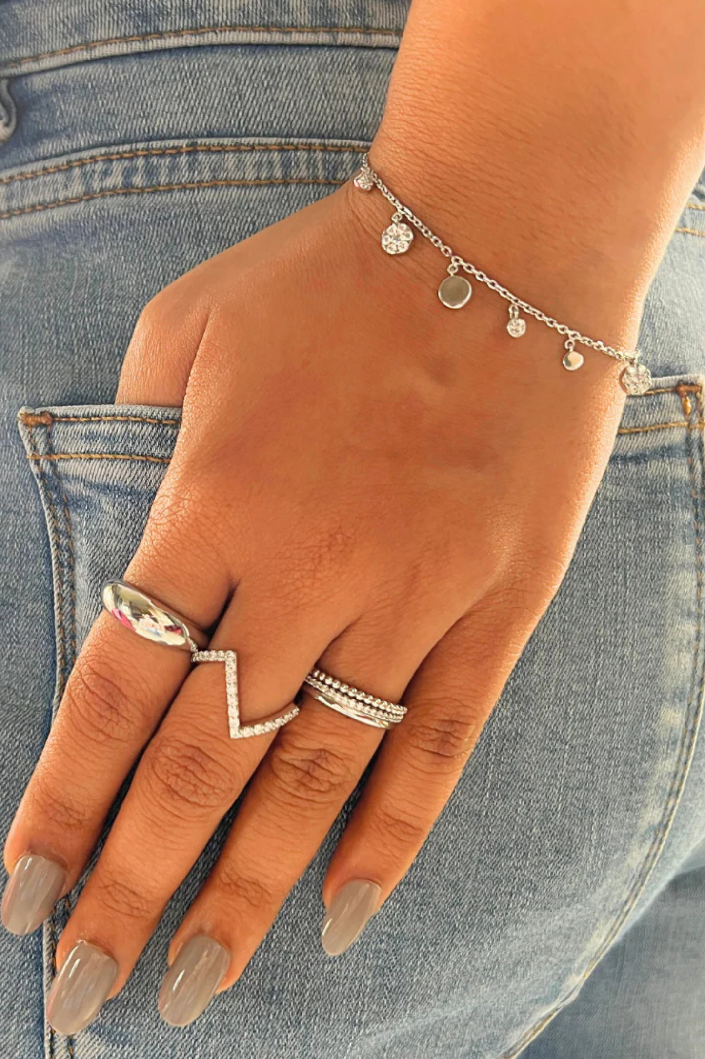 Introducing our Circe Dangle Bracelet where each piece features a mesmerizing array of dangling round charms, varying in size and adorned with both sparkling CZ stones and sleek metal accents. This bracelet captivates with its mystique and charm, adding a touch of magic to any ensemble.