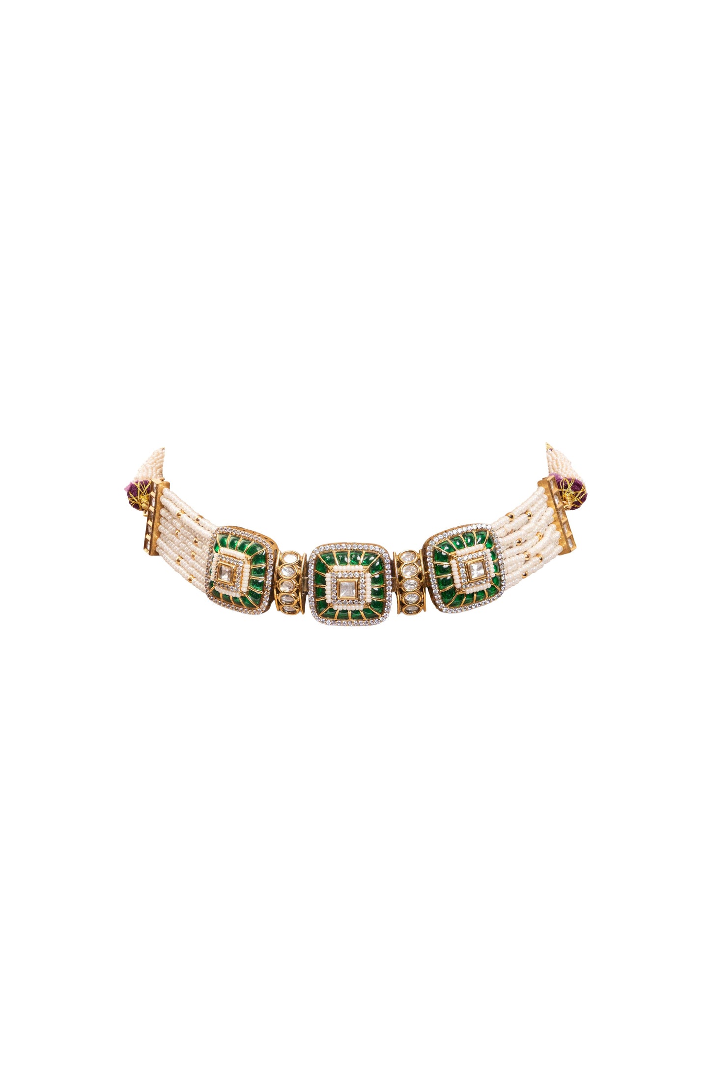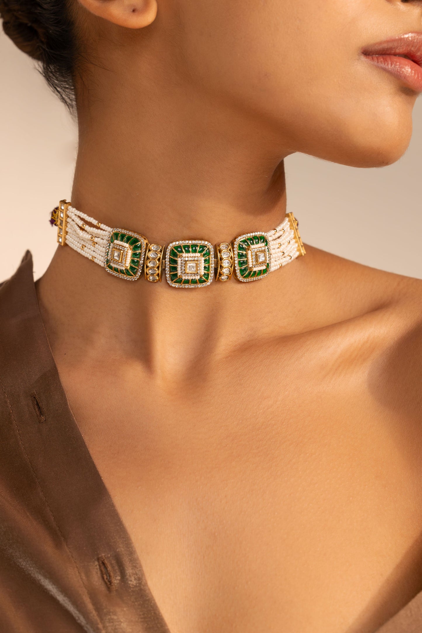 A statement emerald Polki choker handcrafted in an alloy of copper and brass, this piece features three intricately designed square motifs adorned with uncut Polki stones and bordered with deep green enamel. The strands of delicate white beads add a regal touch, making it perfect for festive and bridal occasions.
