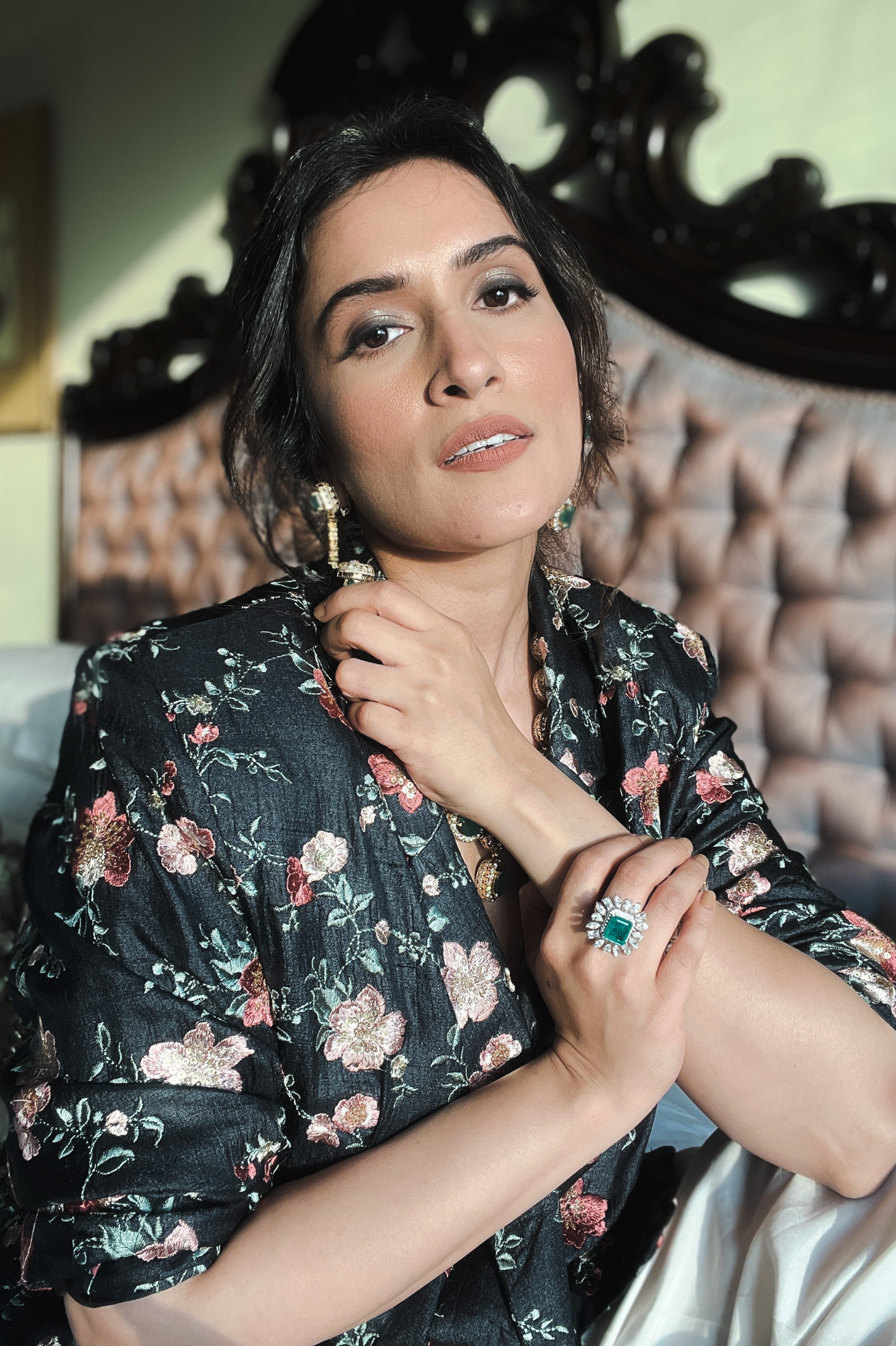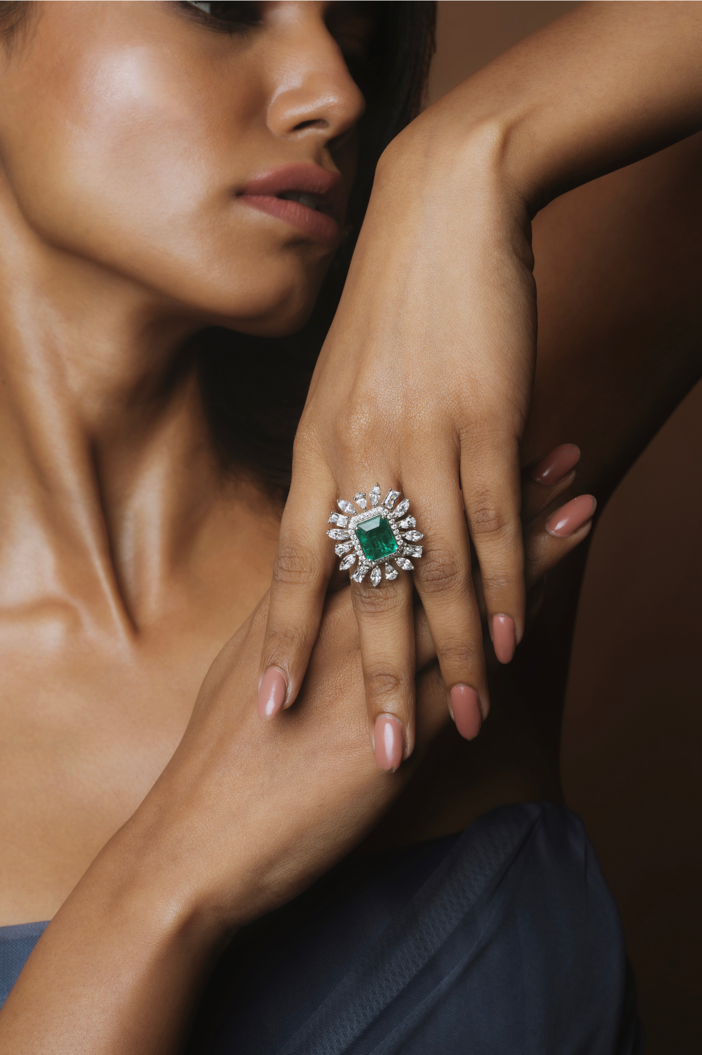 Reign in the majestic charm of our Classé Cocktail Ring, fit for royalty! This captivating piece showcases a stunning faux emerald green doublet stone weighing about 5 carats at its center, exuding an aura of regal splendor. With an artful mix of fancy stones, this ring radiates an enchanting allure, perfect for adding a touch of grandeur to any occasion.