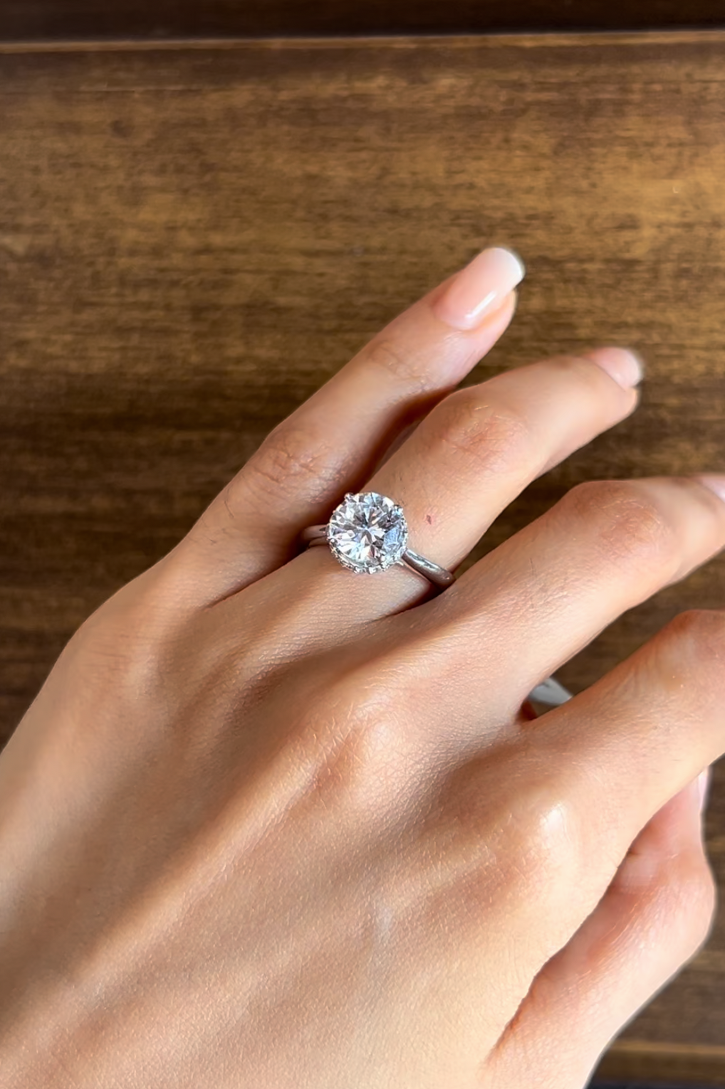 Experience unparalleled elegance with our 8ct Round Solitaire Ring. Set on a delicate band and secured by a timeless four-claw setting, this ring features a hidden halo that subtly enhances its brilliance. Its sophisticated design makes it an exquisite symbol of enduring love and commitment.