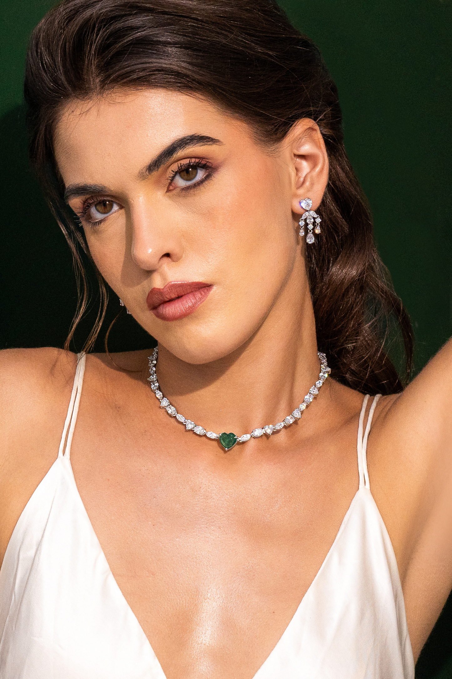 Not all statements need to be loud—some speak straight to the heart. The Heartline Necklace features a captivating green heart-shaped centerpiece, framed by an elegant arrangement of multi-cut fancy stones that shimmer with every move. Bold yet graceful, it’s a piece that effortlessly captures attention while staying true to what matters most—style with soul.