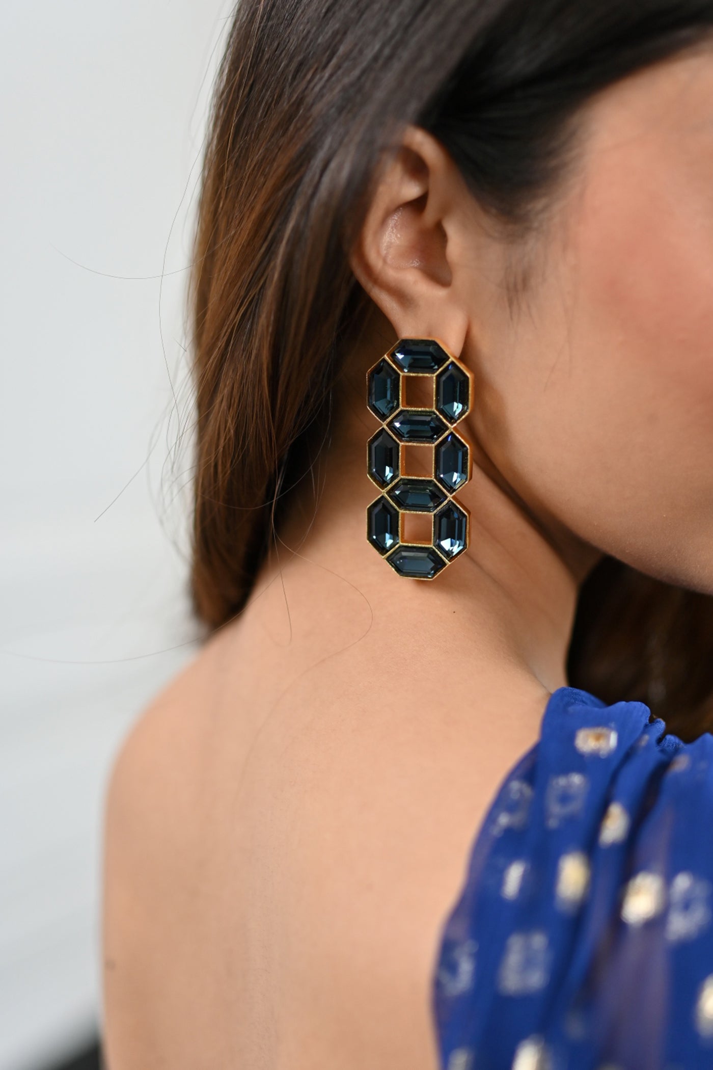 A stunning pair of statement studs set with Blue Swarovski crystals, 18 kt gold polished. Light weight. Push back closure