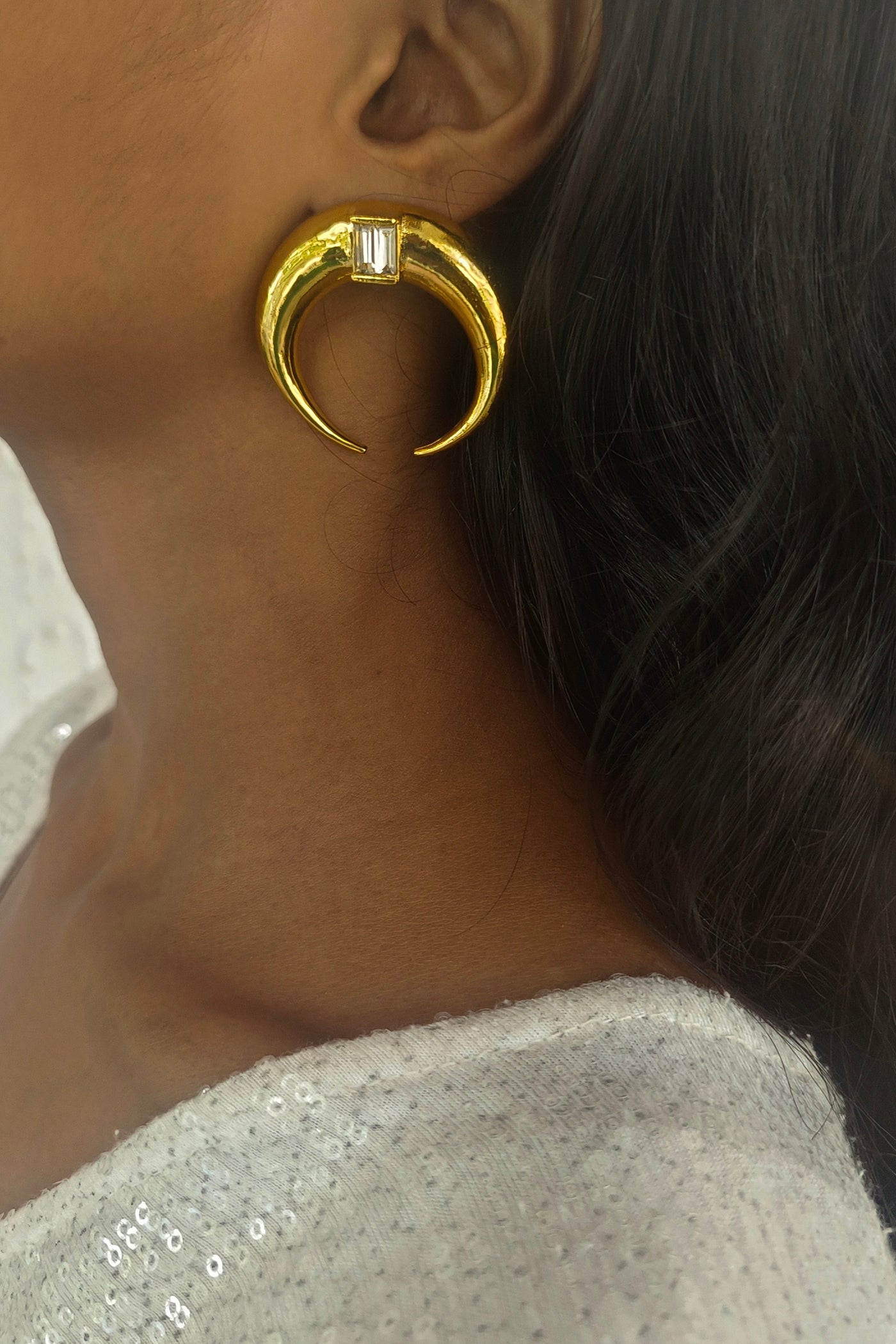 Gold statement moon hoops set with emerald green baguette crystals. Push back closure