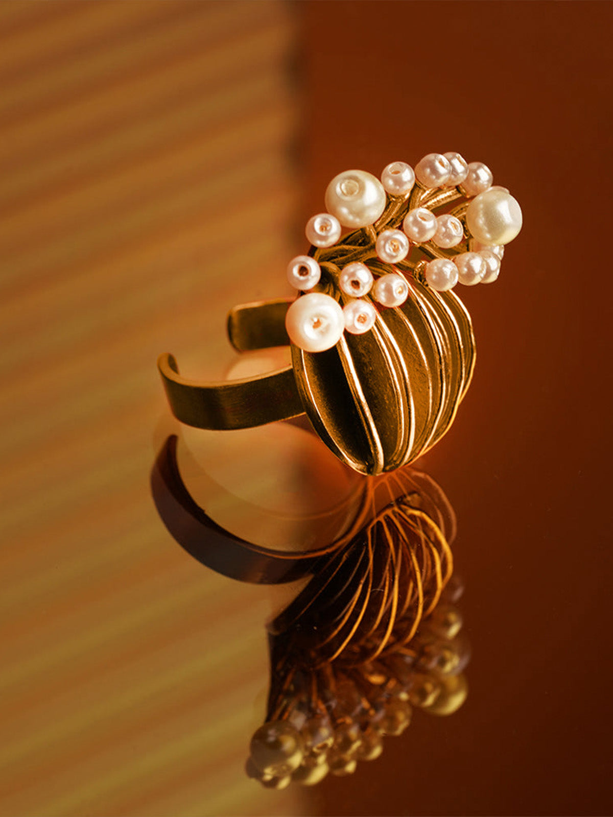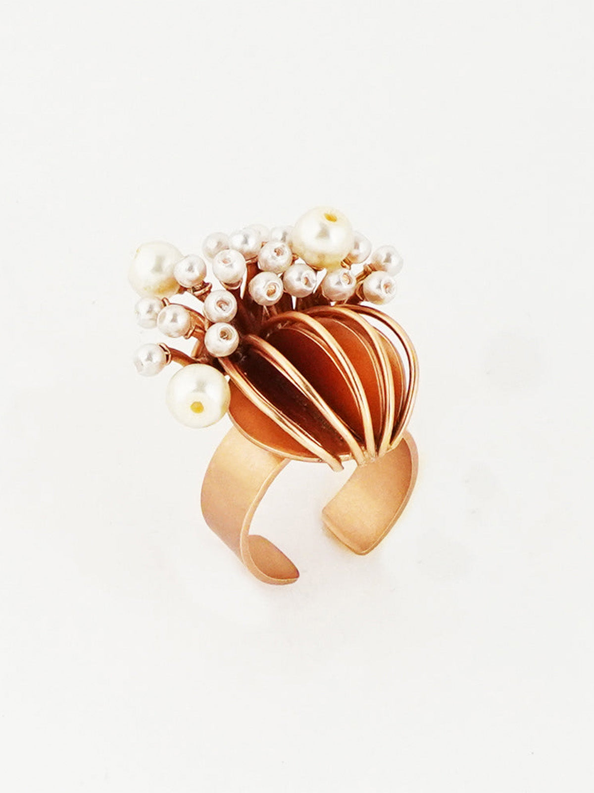 Stylish Coral White Pearl ring crafted in beautiful plated gold. The coral and pearl are set in a bouquet style, adding a lifelike organic feel to the ring.